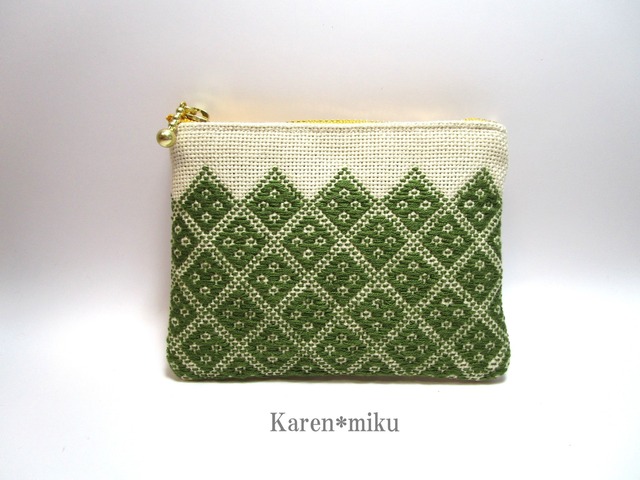 『こぎん刺し』✳️花束模様✳️ファスナーポーチ◆ベージュ*若草色◆