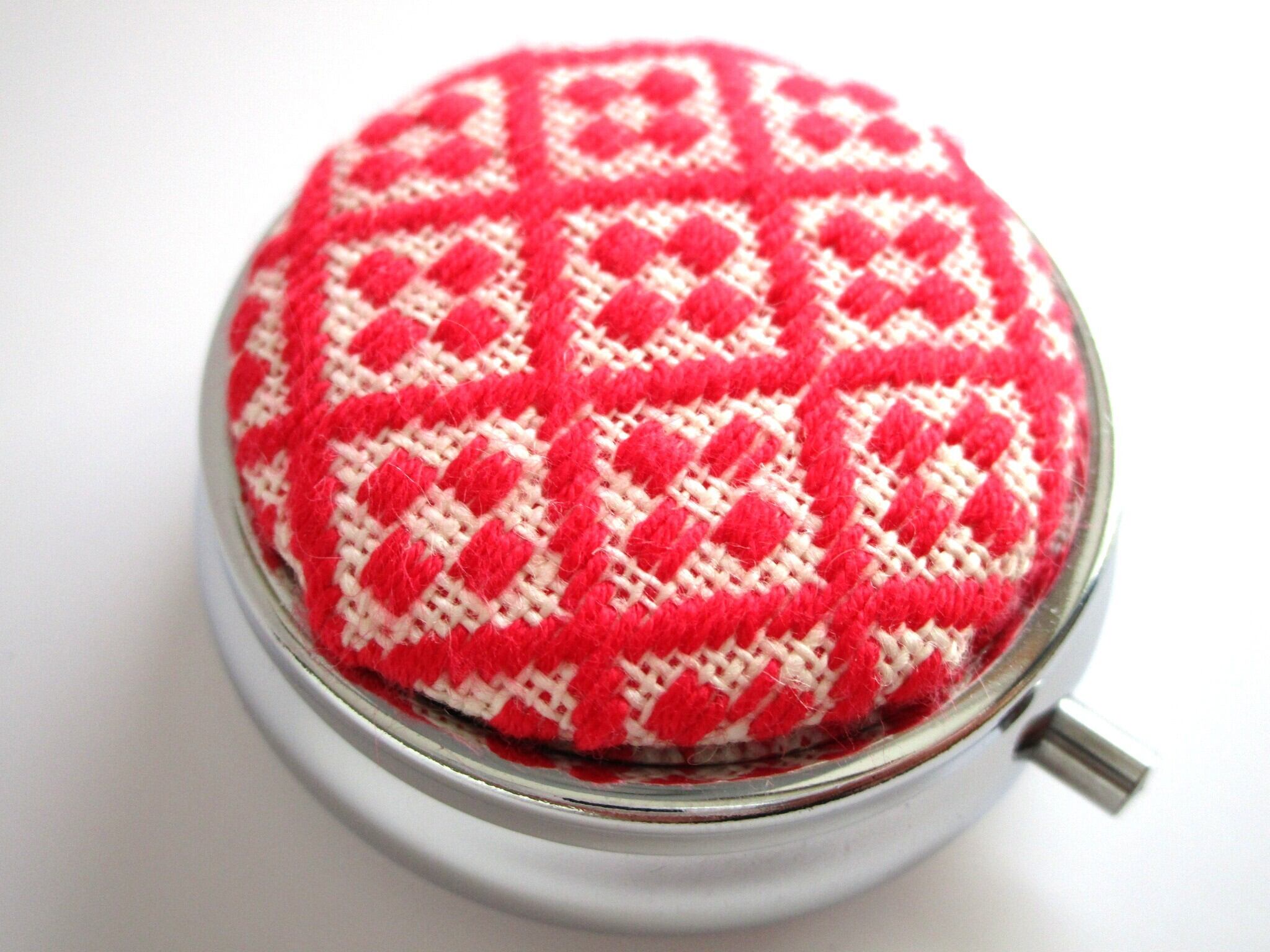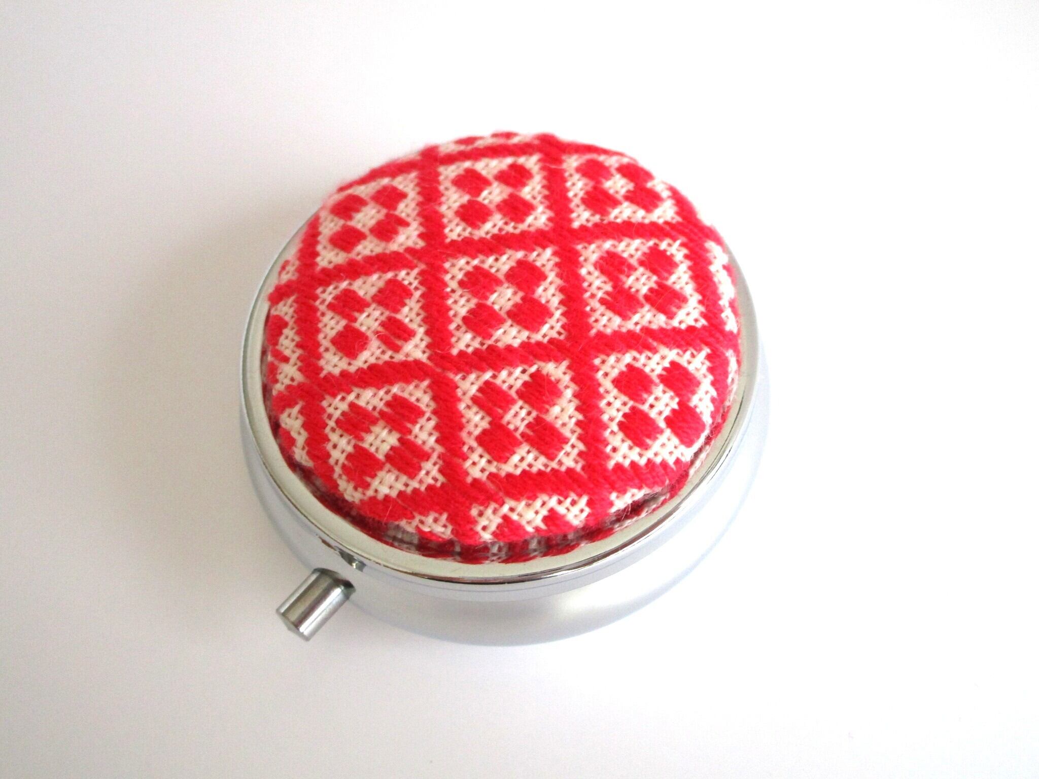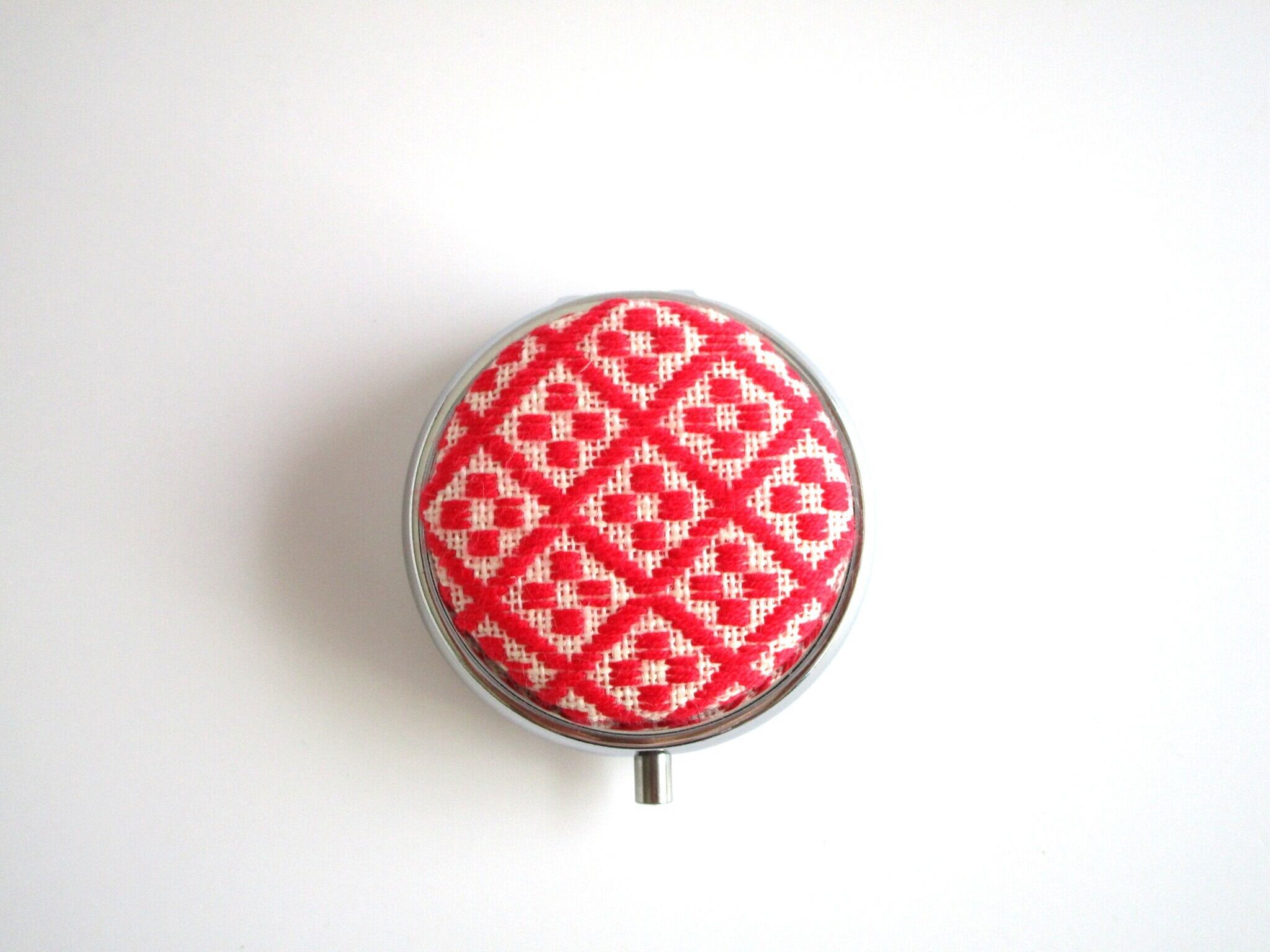 青森県津軽地方の伝統工芸『こぎん刺し』を施しました、ころんとした形が可愛いアクセサリーケース・ピルケースです。