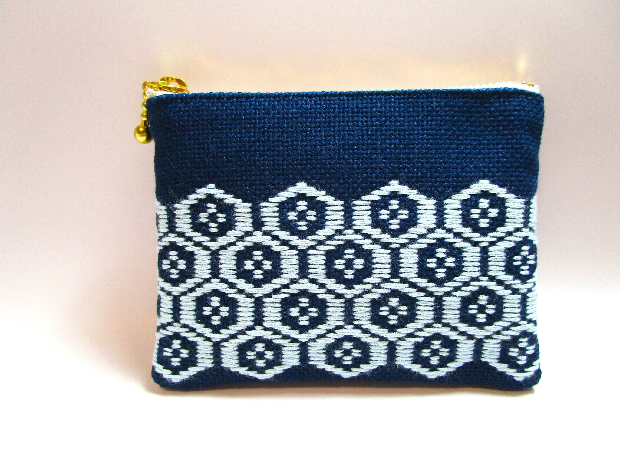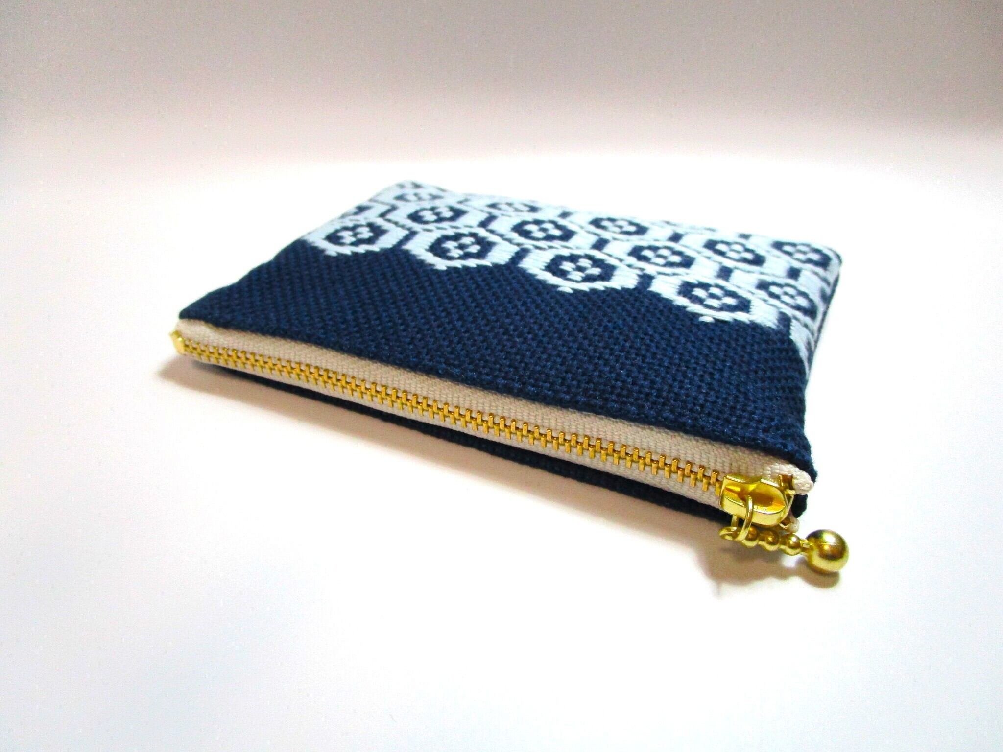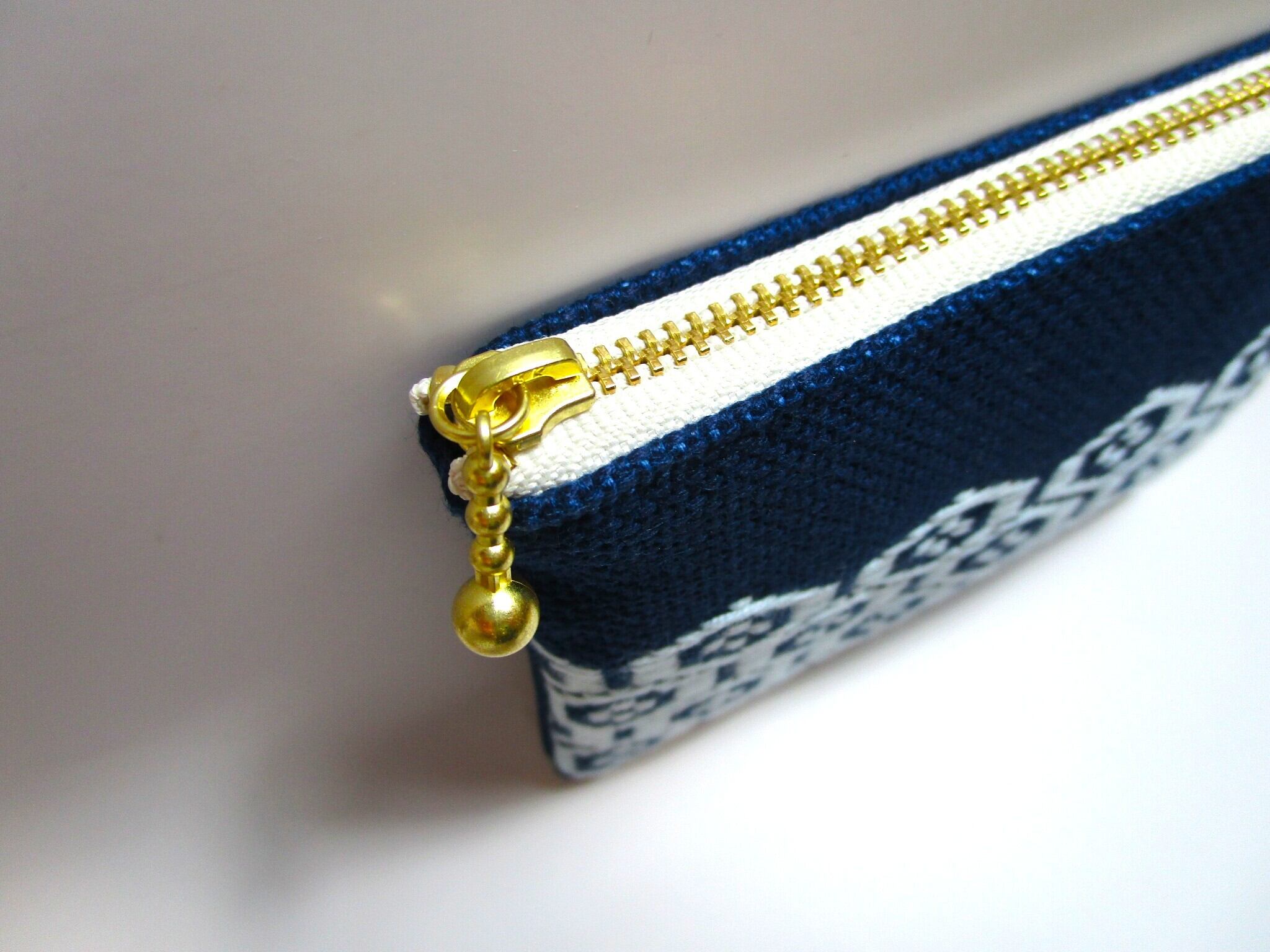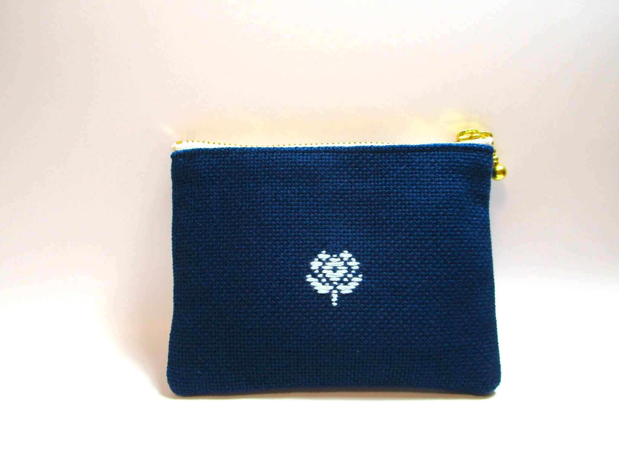 青森県津軽地方の伝統工芸『こぎん刺し』を施しました、紺色と水色の美しいコントラストが魅力のファスナーポーチです。