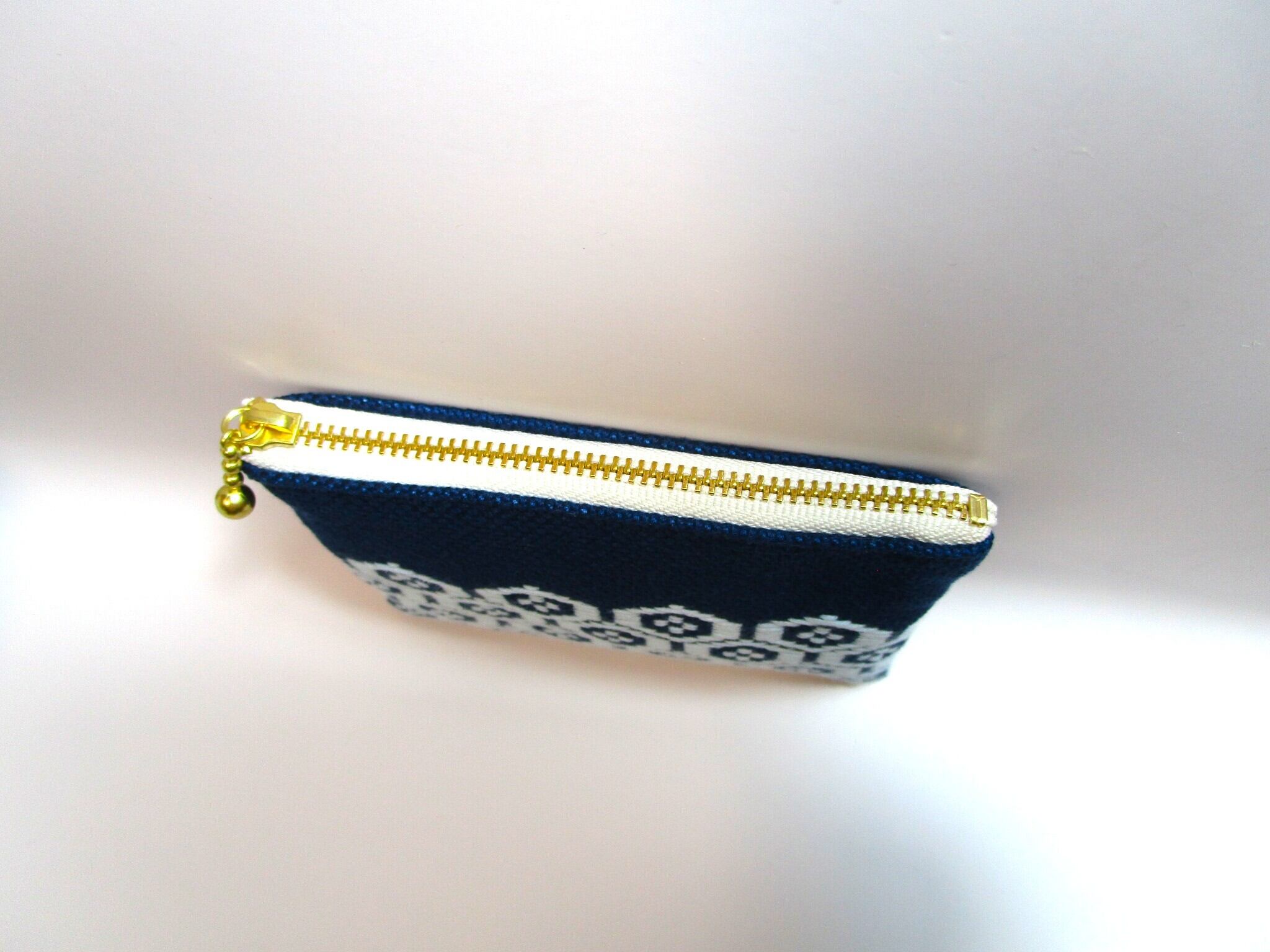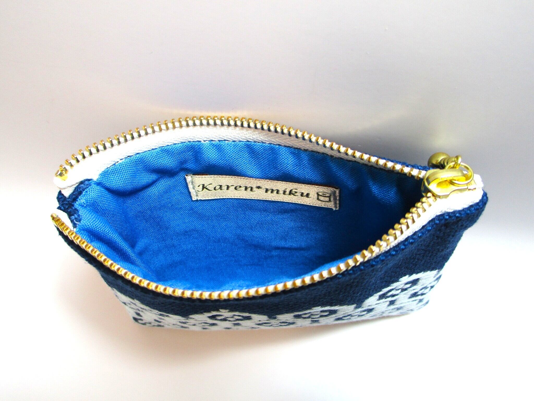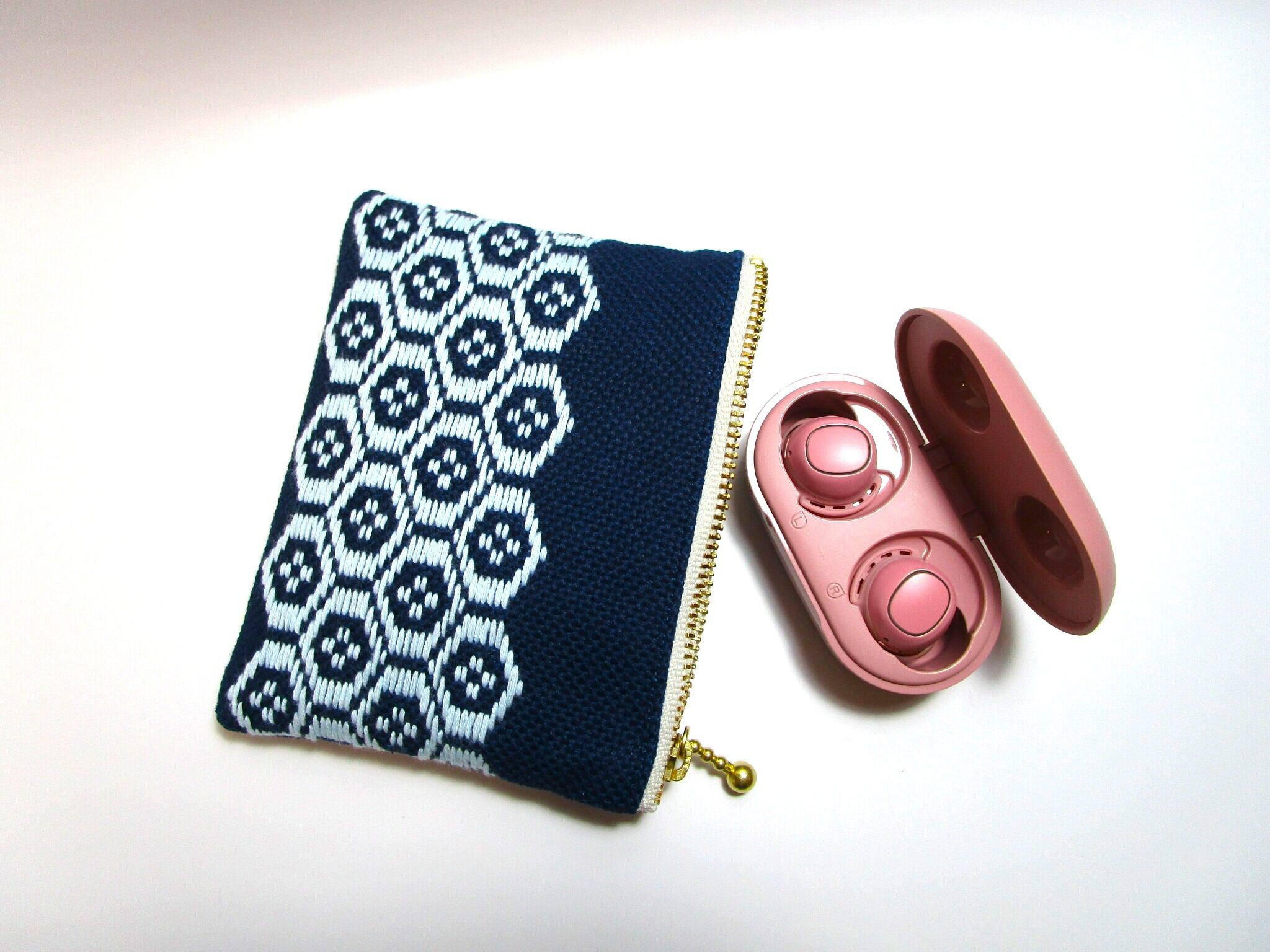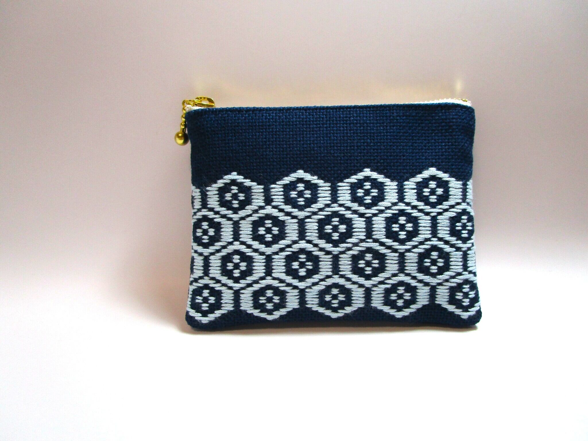 青森県津軽地方の伝統工芸『こぎん刺し』を施しました、紺色と水色の美しいコントラストが魅力のファスナーポーチです。