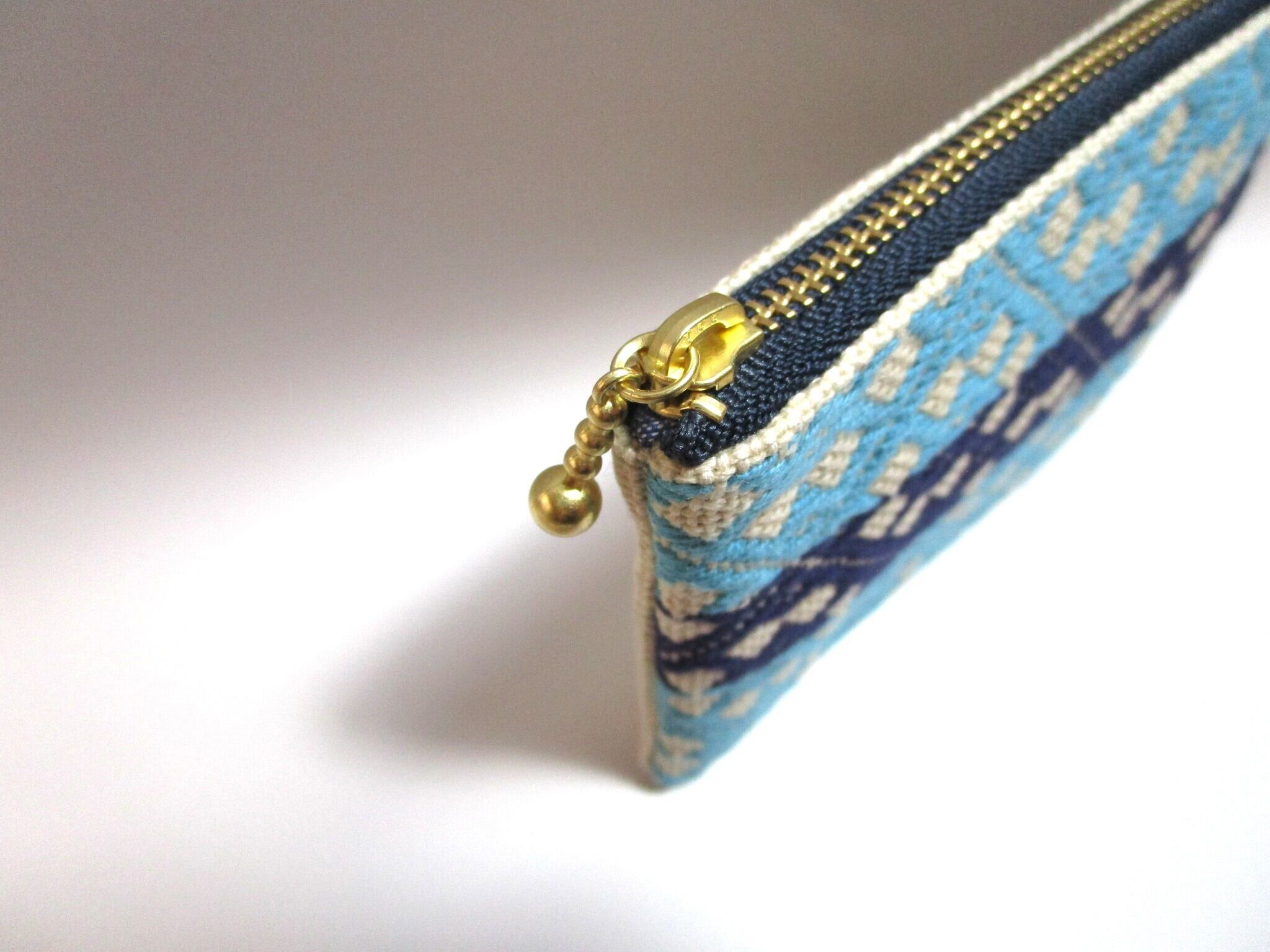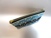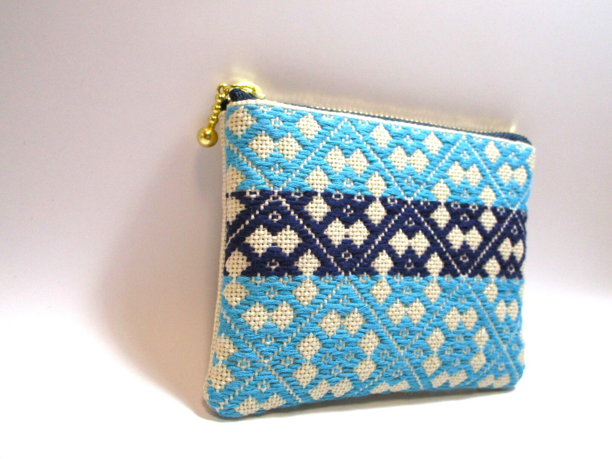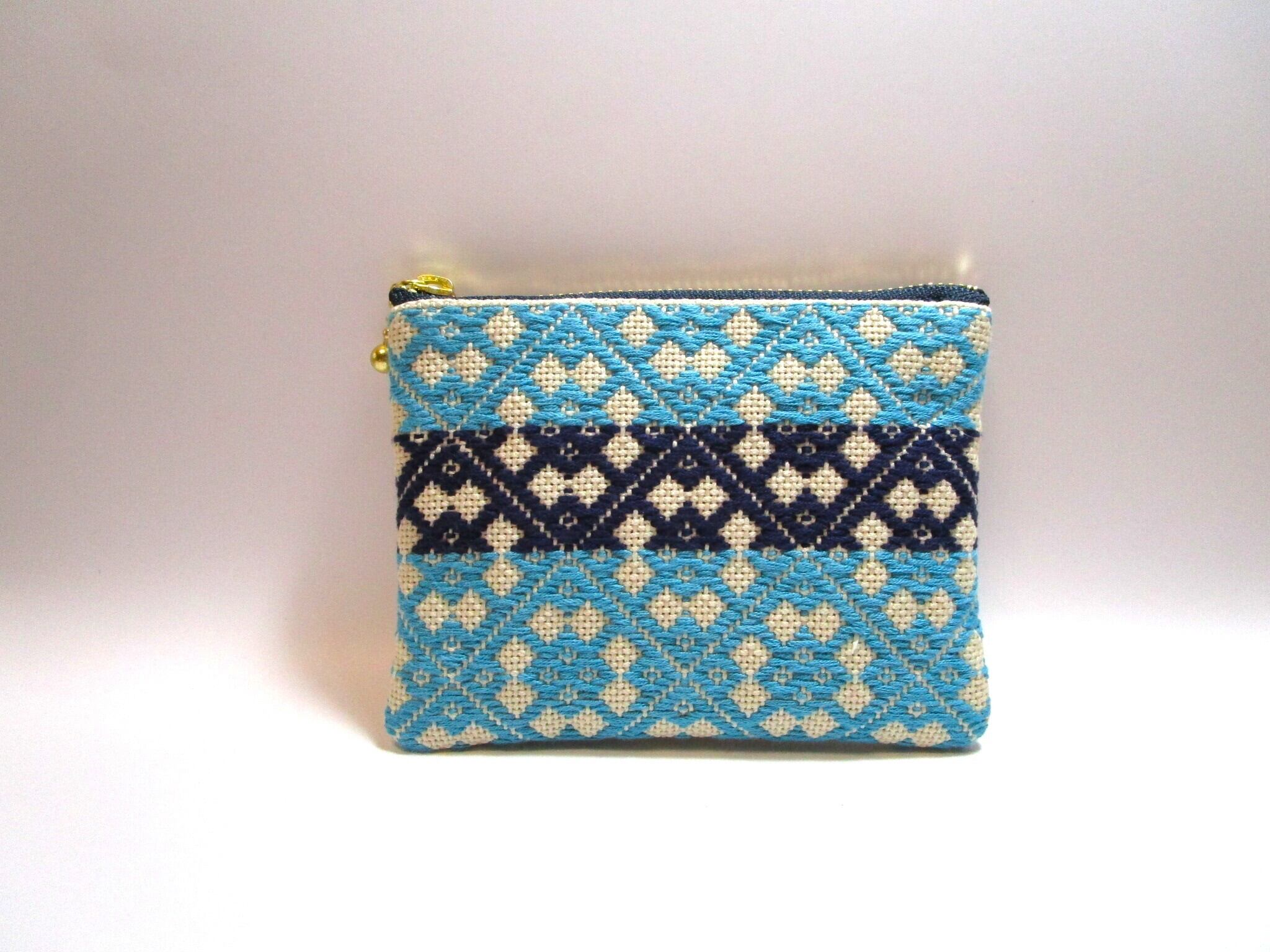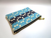 青森県津軽地方の伝統工芸『こぎん刺し』を施しました、ベージュにターコイズとネイビーの美しいコントラストが魅力のファスナーポーチです。