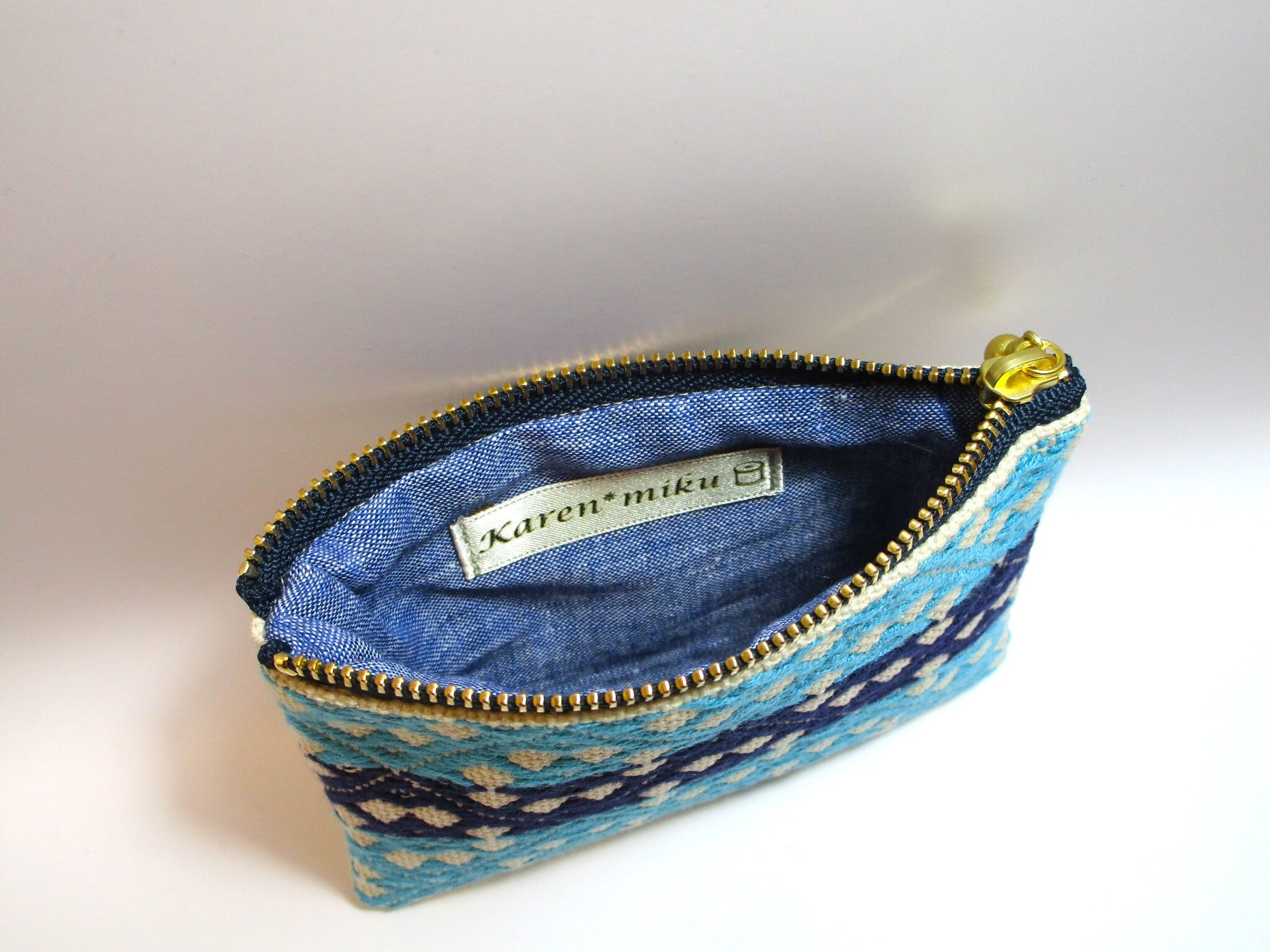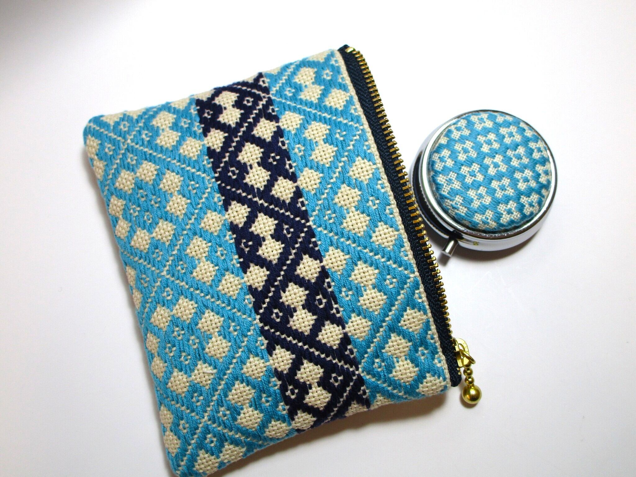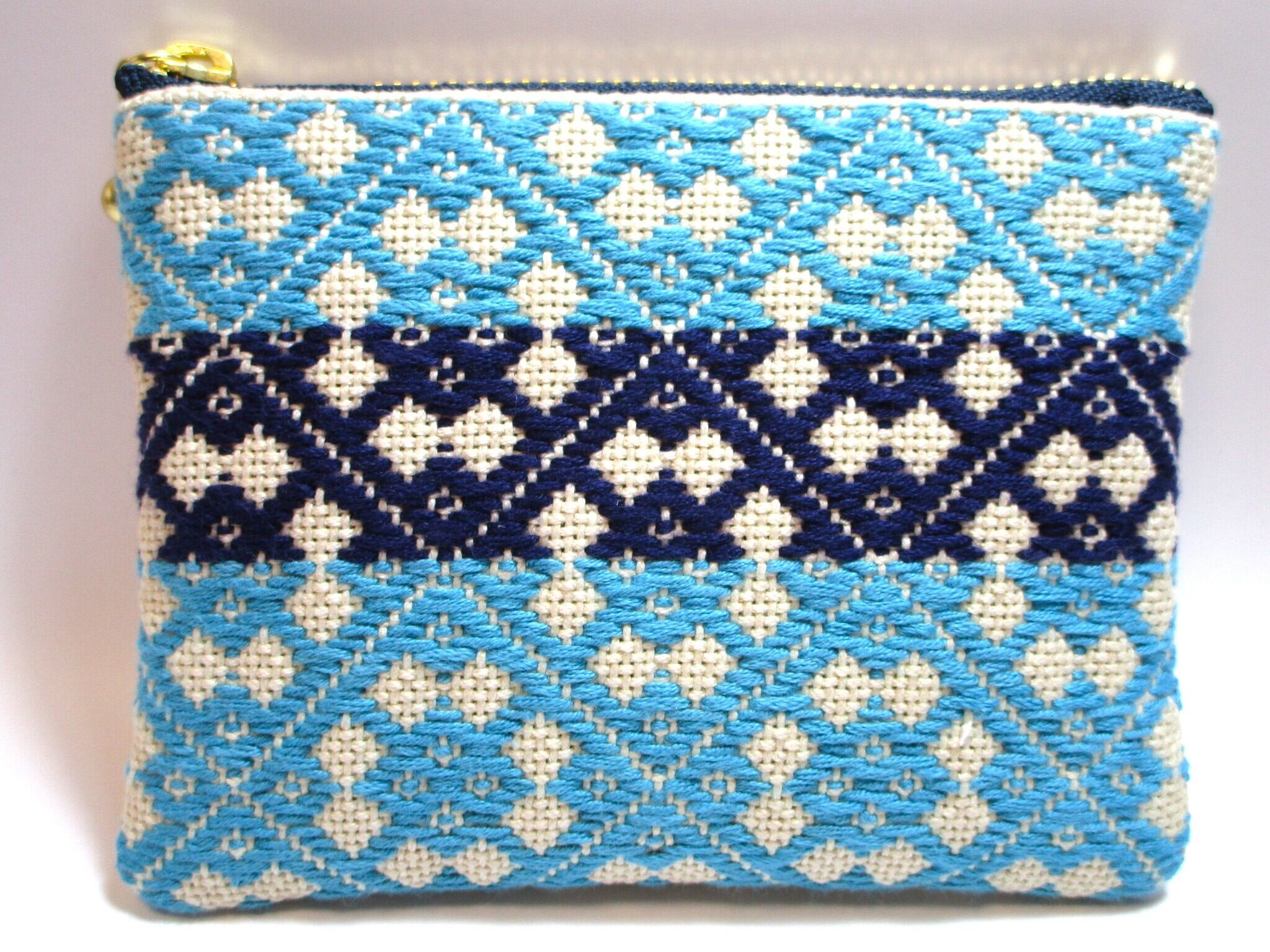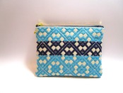 青森県津軽地方の伝統工芸『こぎん刺し』を施しました、ベージュにターコイズとネイビーの美しいコントラストが魅力のファスナーポーチです。
