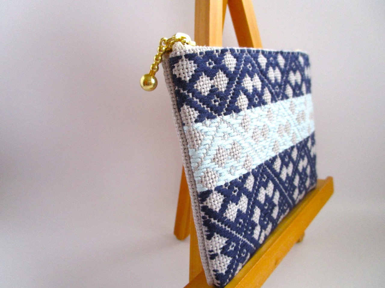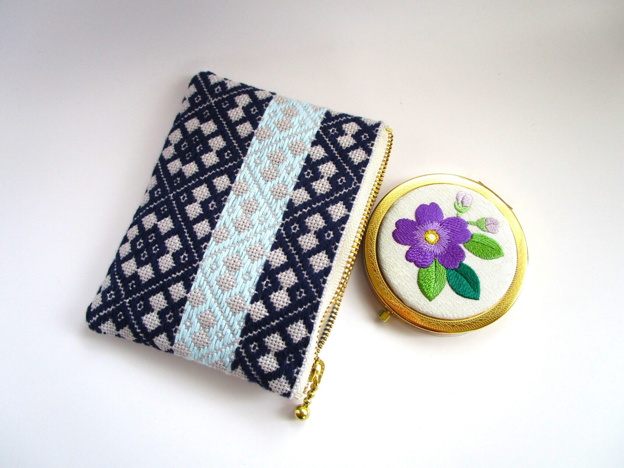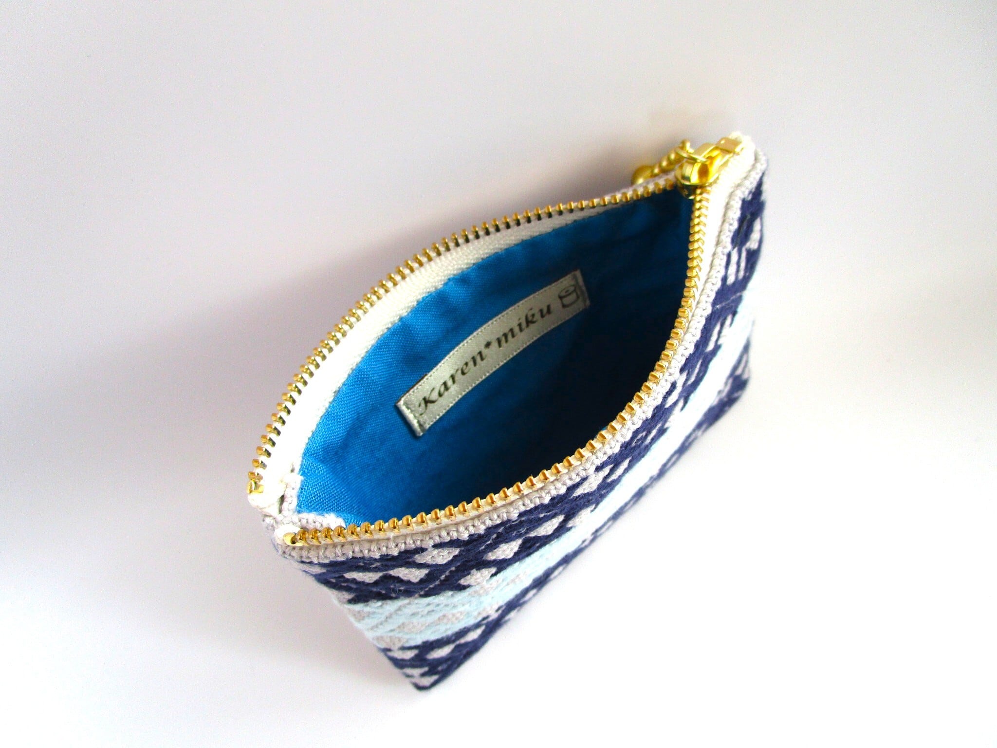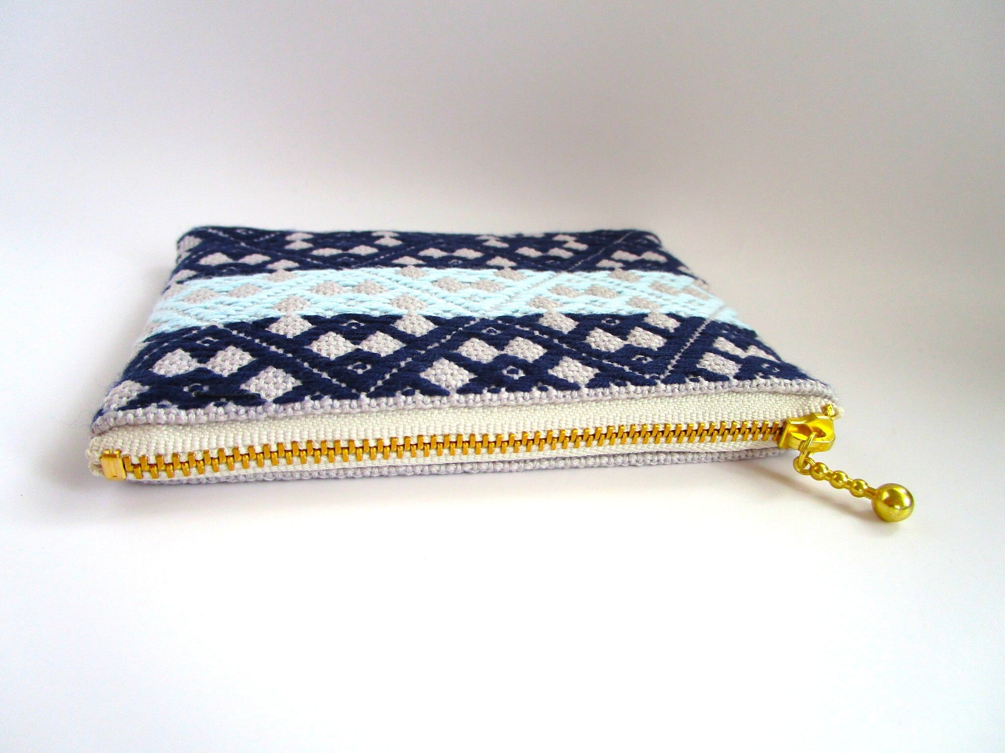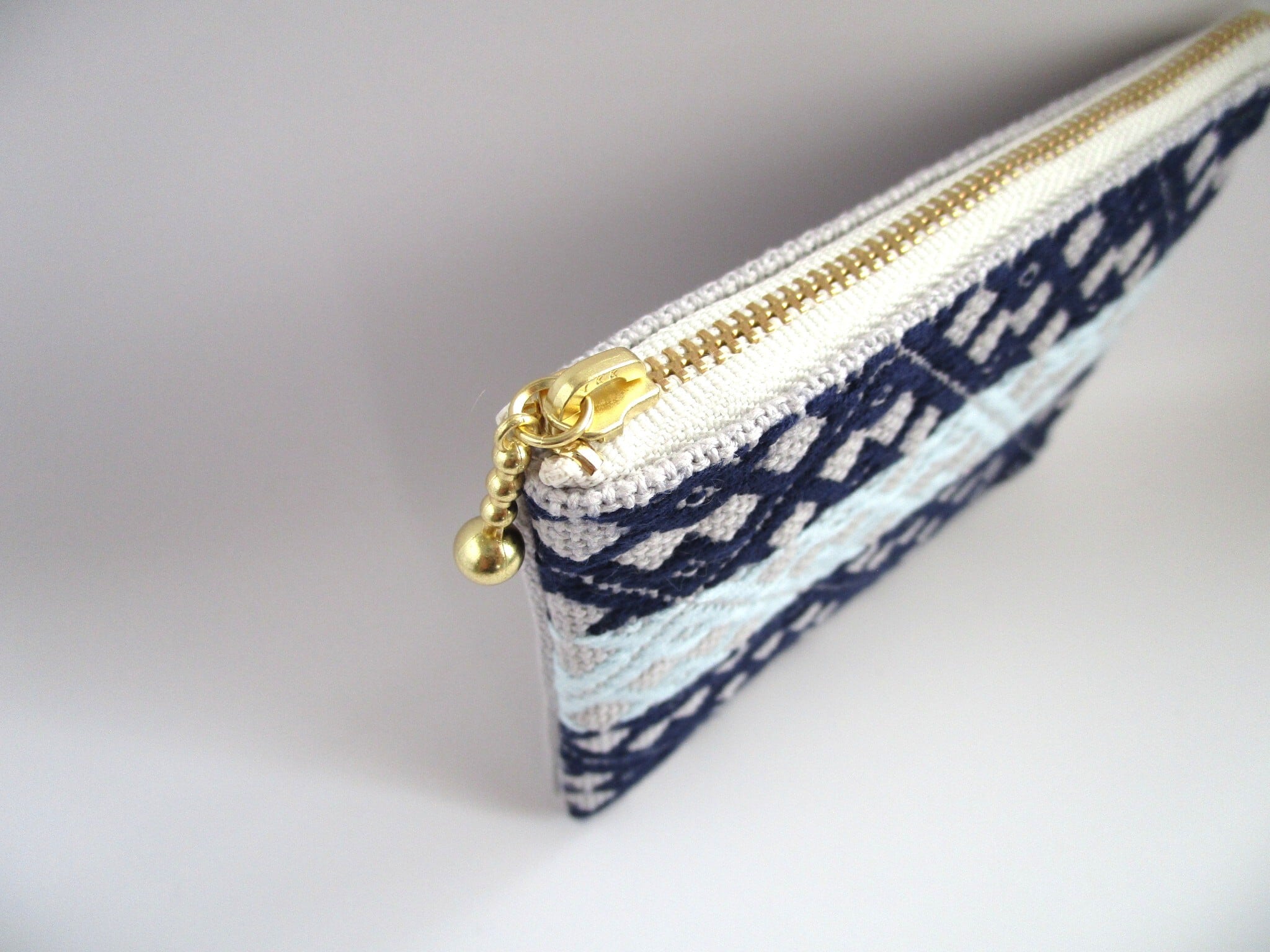 青森県津軽地方の伝統工芸『こぎん刺し』を施しました、ライトグレイに紺色と水色の美しいコントラストが魅力のファスナーポーチです。