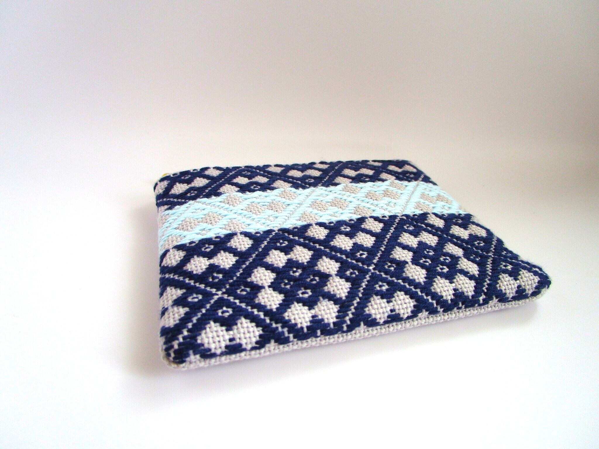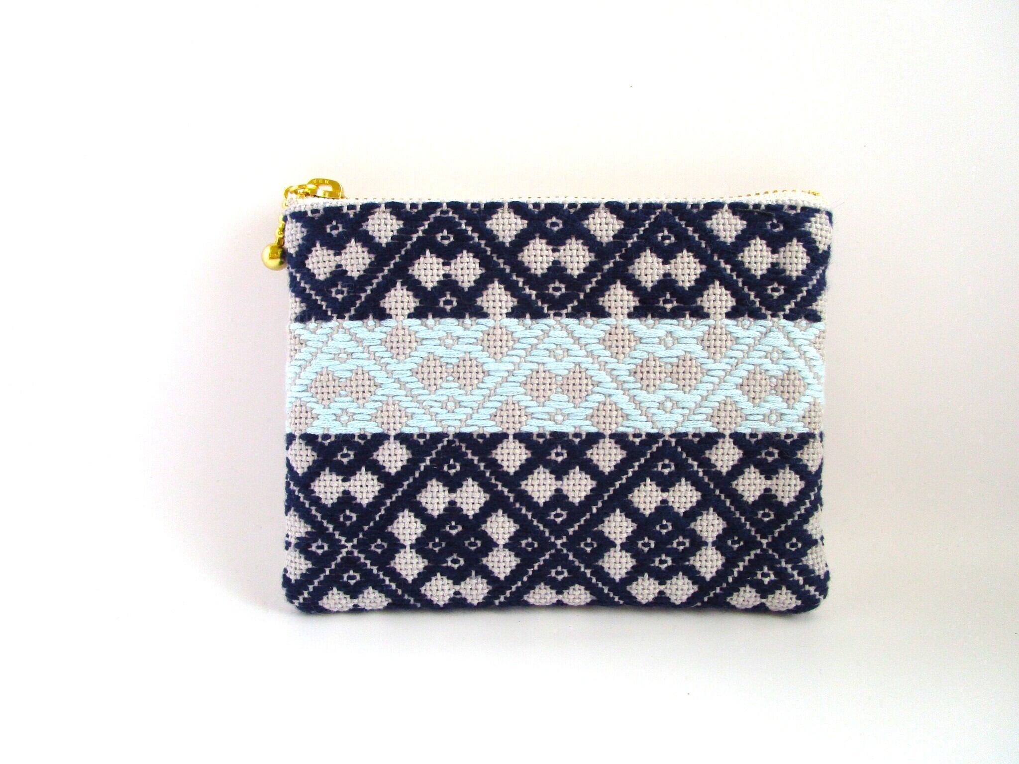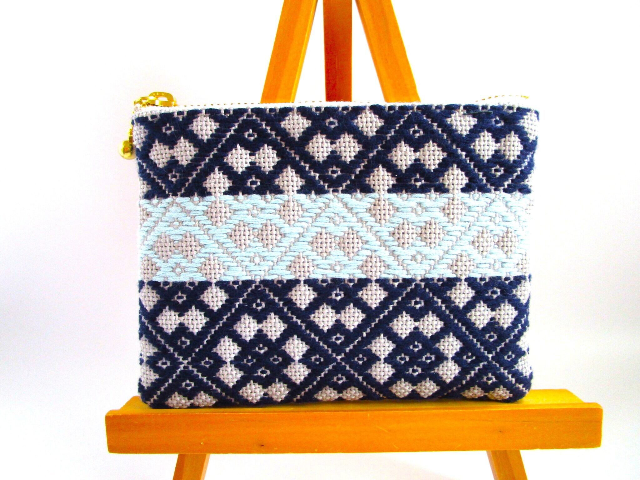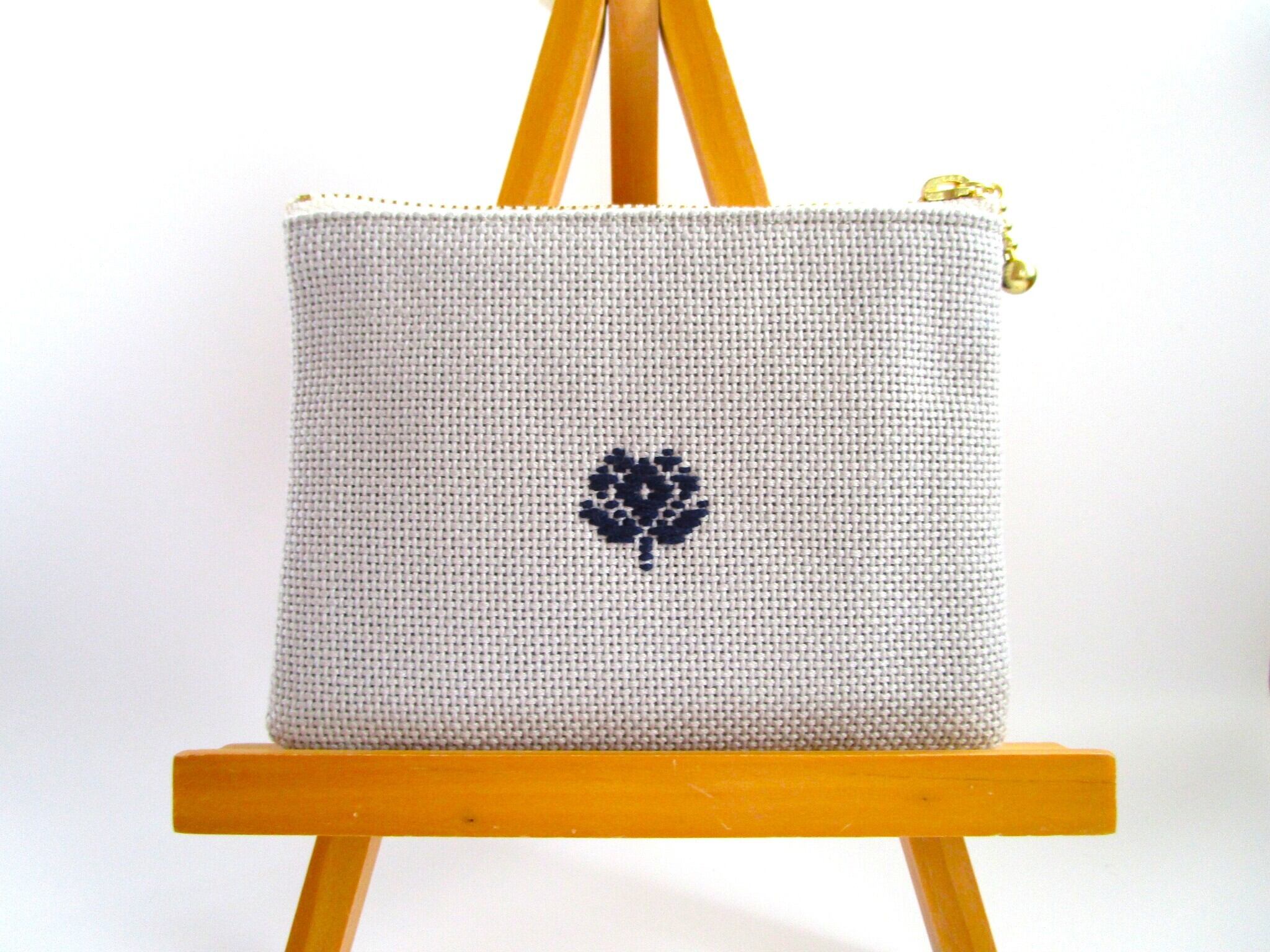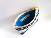 青森県津軽地方の伝統工芸『こぎん刺し』を施しました、ライトグレイに紺色と水色の美しいコントラストが魅力のファスナーポーチです。