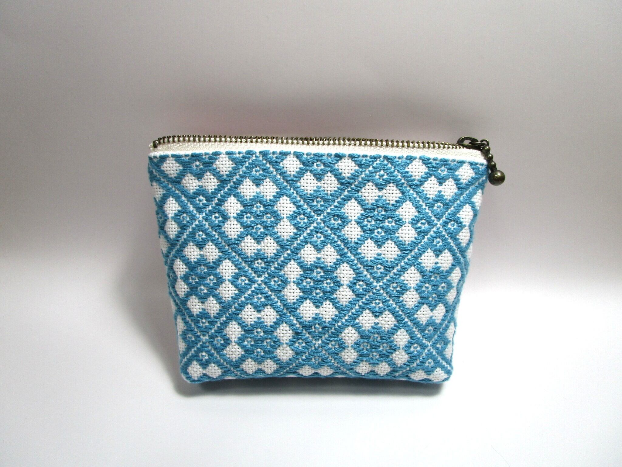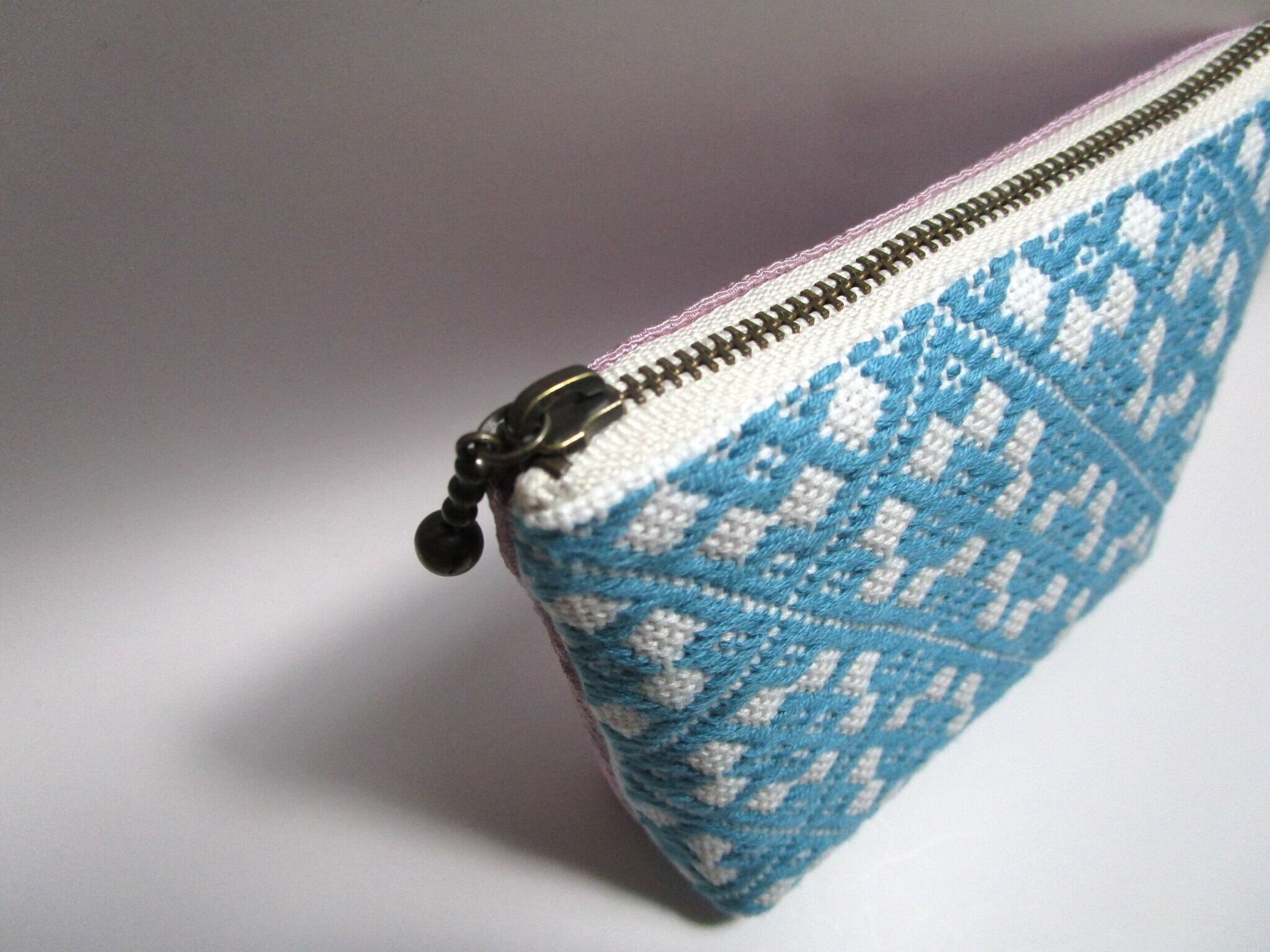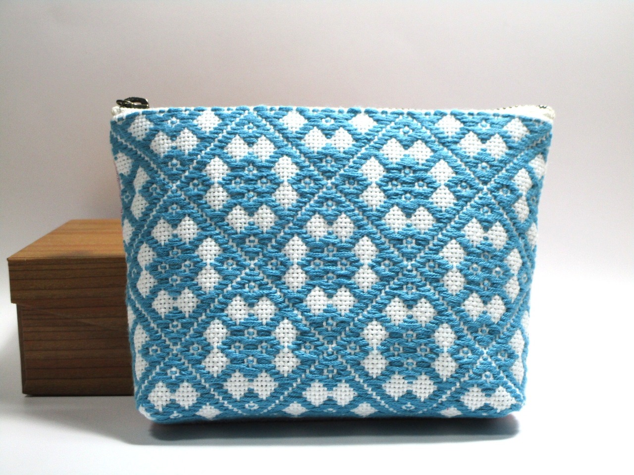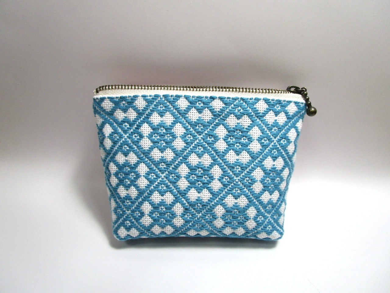 青森県津軽地方の伝統工芸『こぎん刺し』を施しました、ホワイトにターコイズの美しいコントラストが魅力の3cm幅マチ付きのファスナーポーチです。