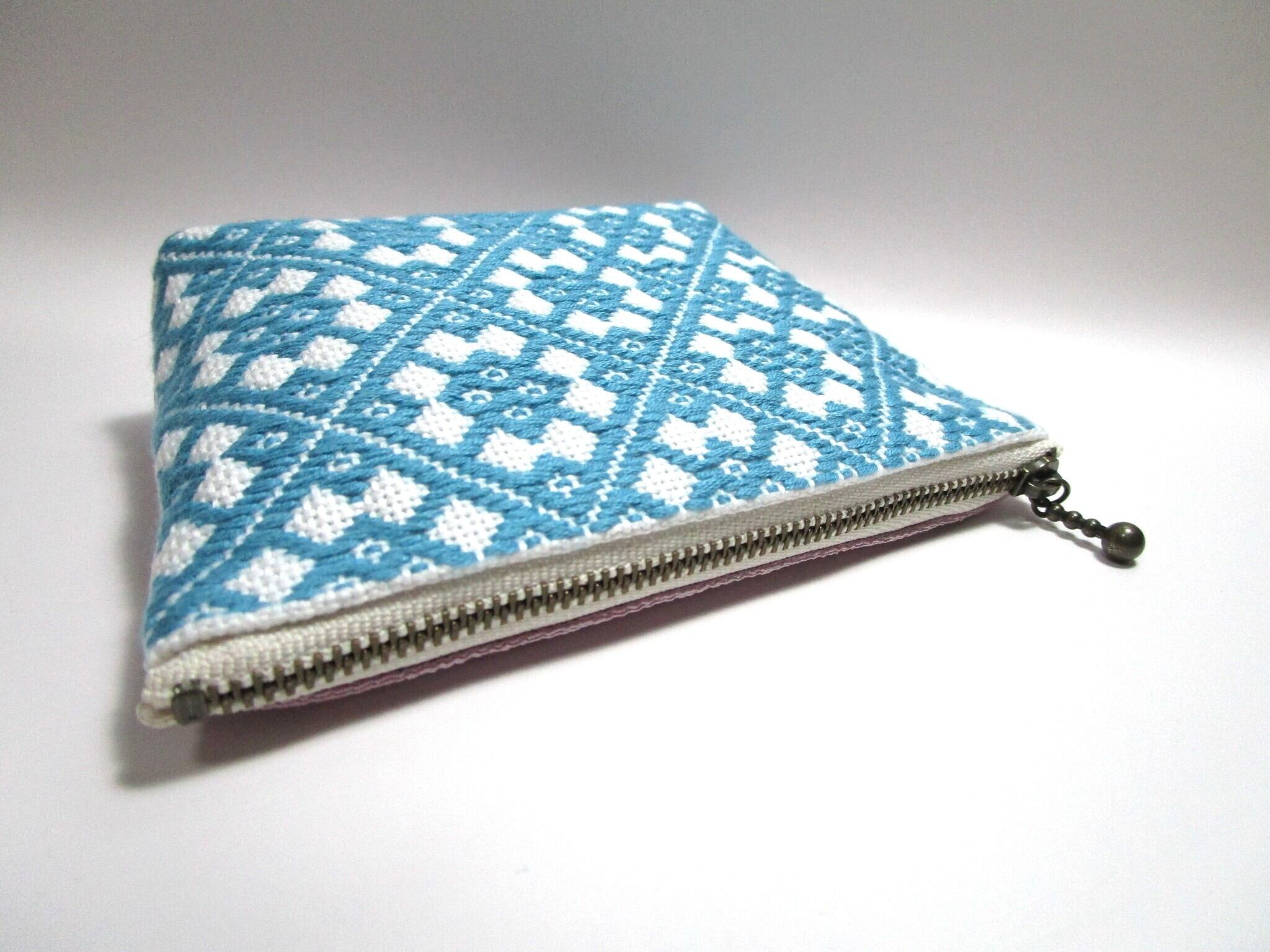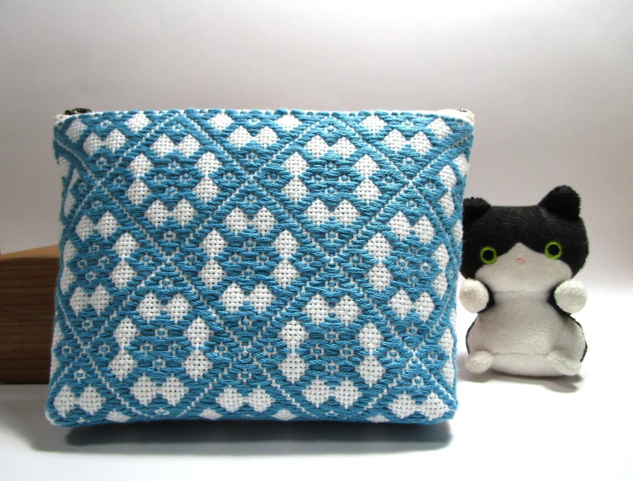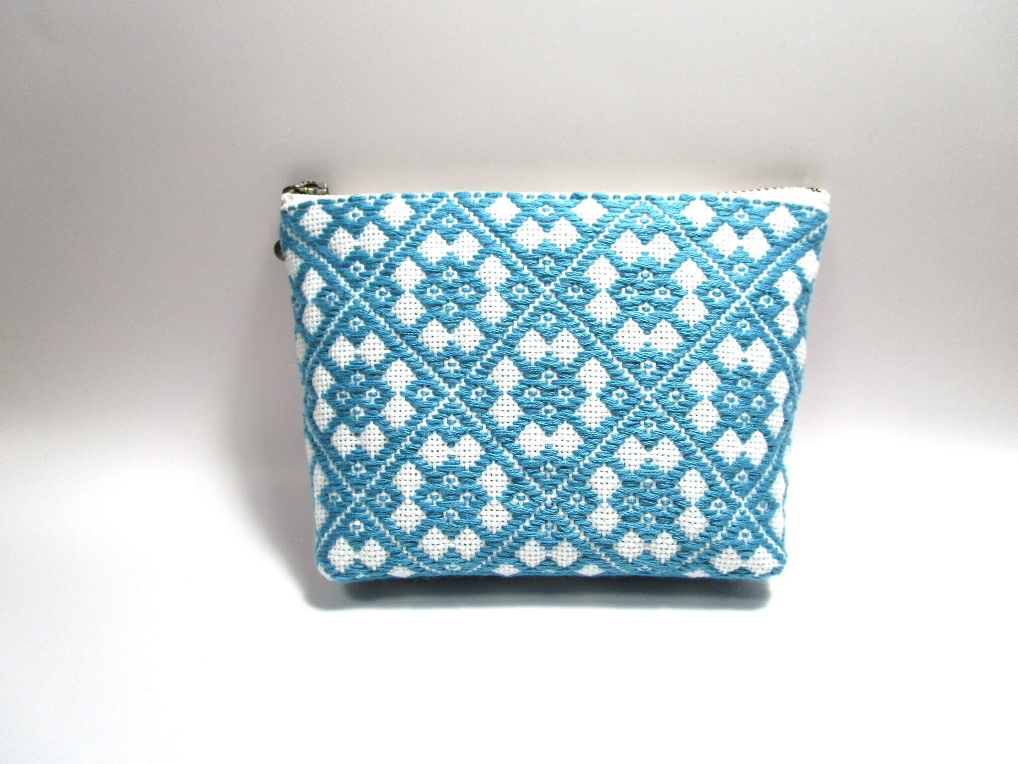 青森県津軽地方の伝統工芸『こぎん刺し』を施しました、ホワイトにターコイズの美しいコントラストが魅力の3cm幅マチ付きのファスナーポーチです。