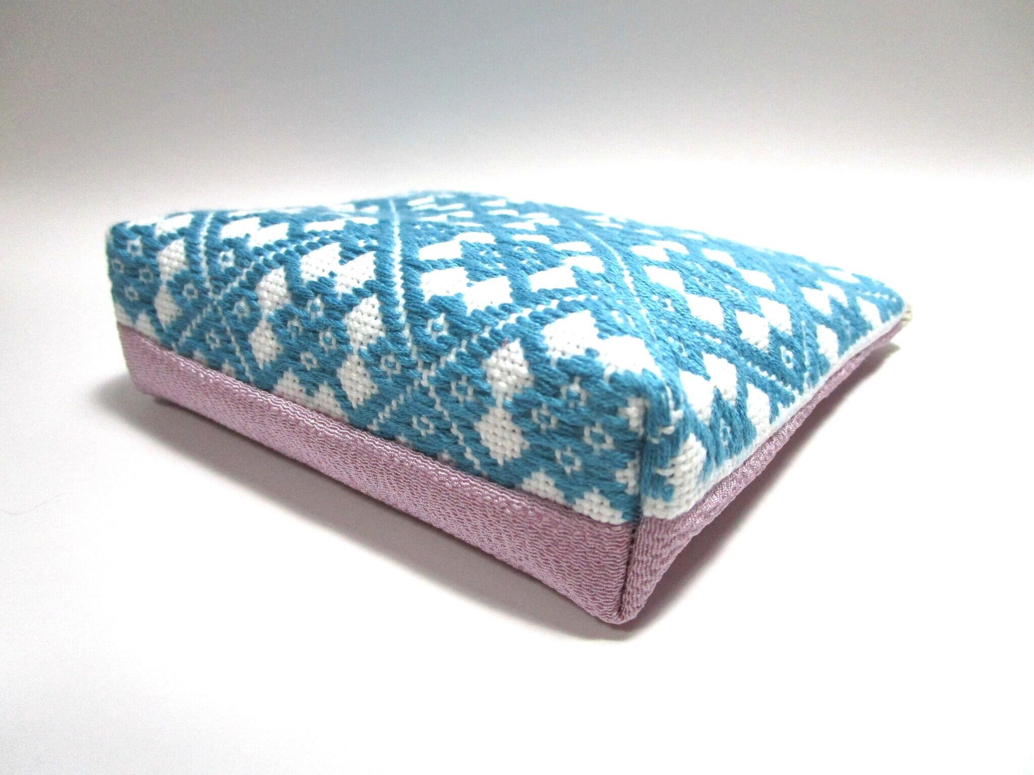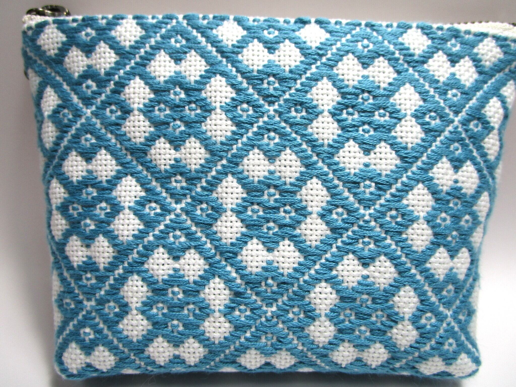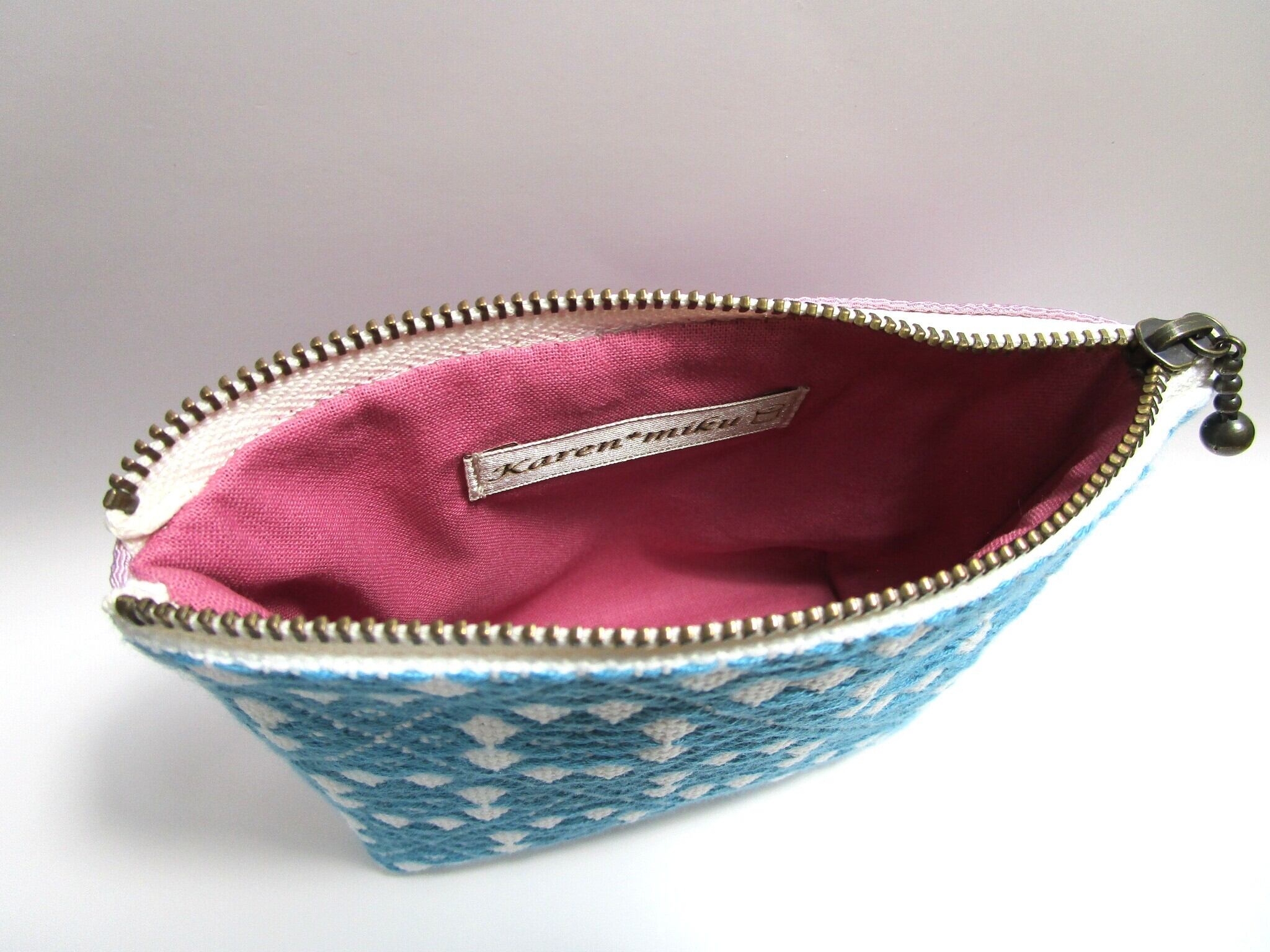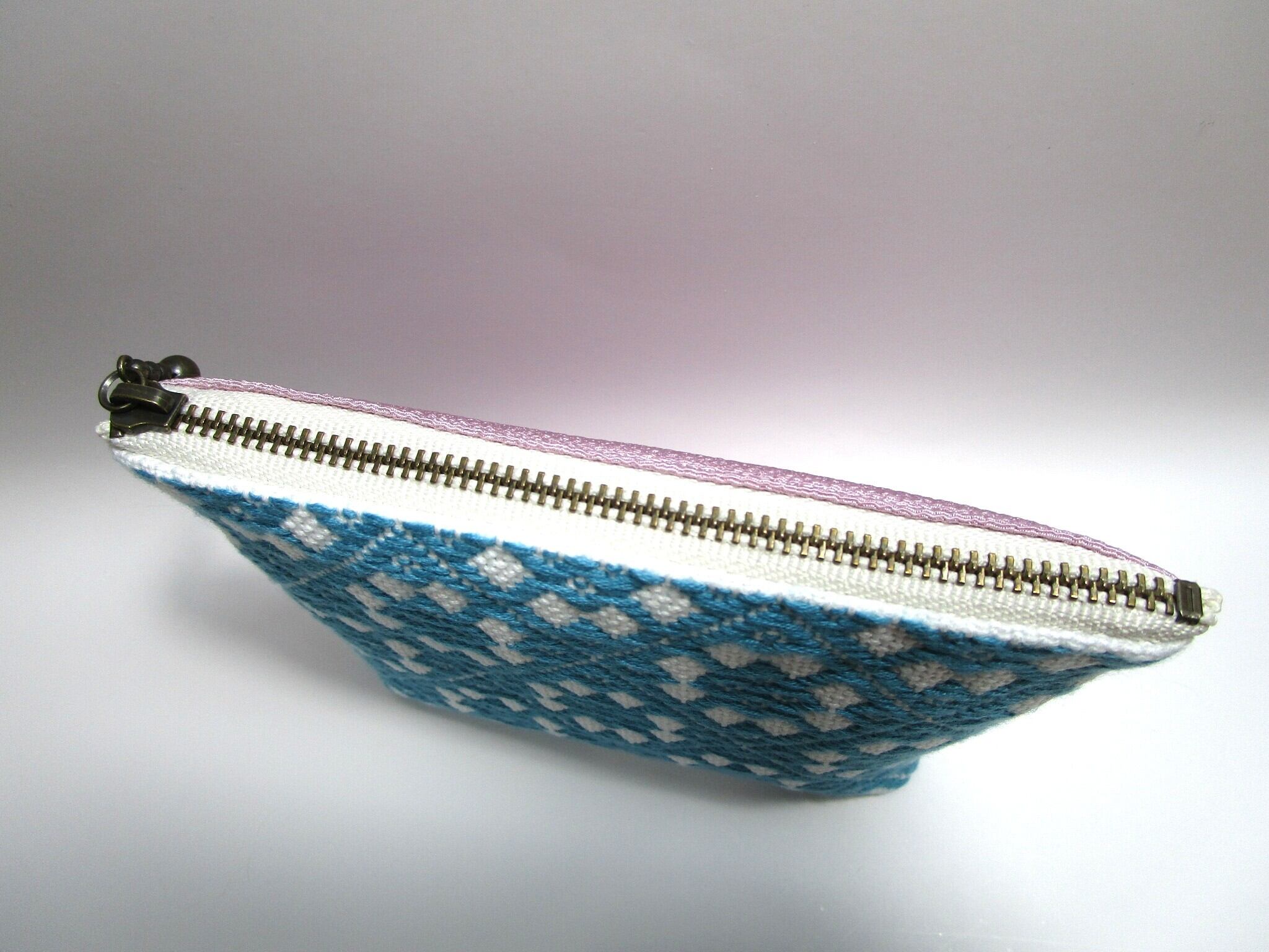 青森県津軽地方の伝統工芸『こぎん刺し』を施しました、ホワイトにターコイズの美しいコントラストが魅力の3cm幅マチ付きのファスナーポーチです。