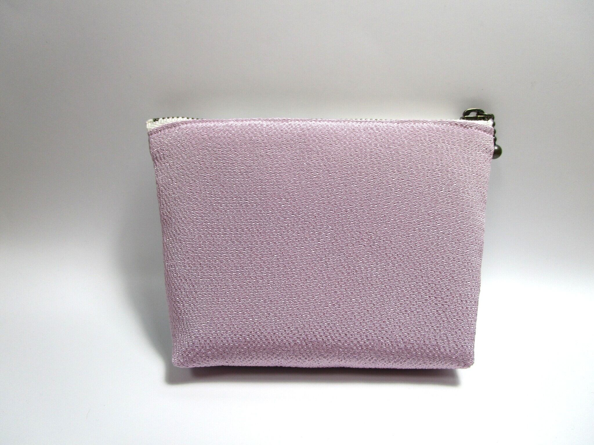 後ろ布には薄藤色をした丹後ちりめんの正絹生地を使っており、いろんな場面でお使いいただける大人可愛い、上品なポーチに仕上げています。