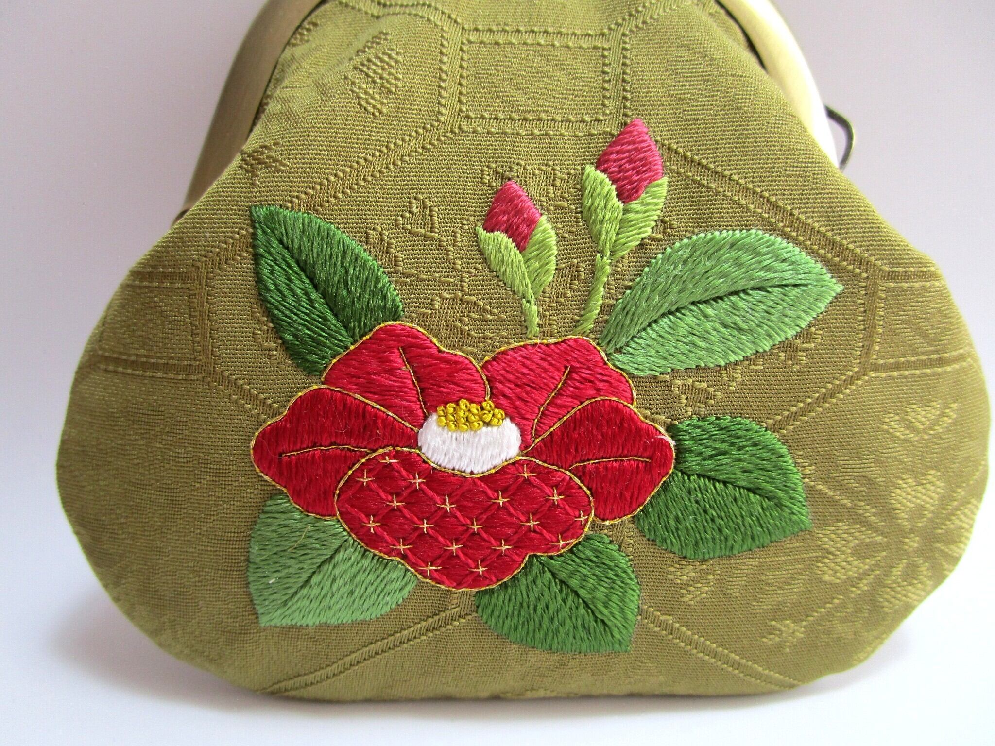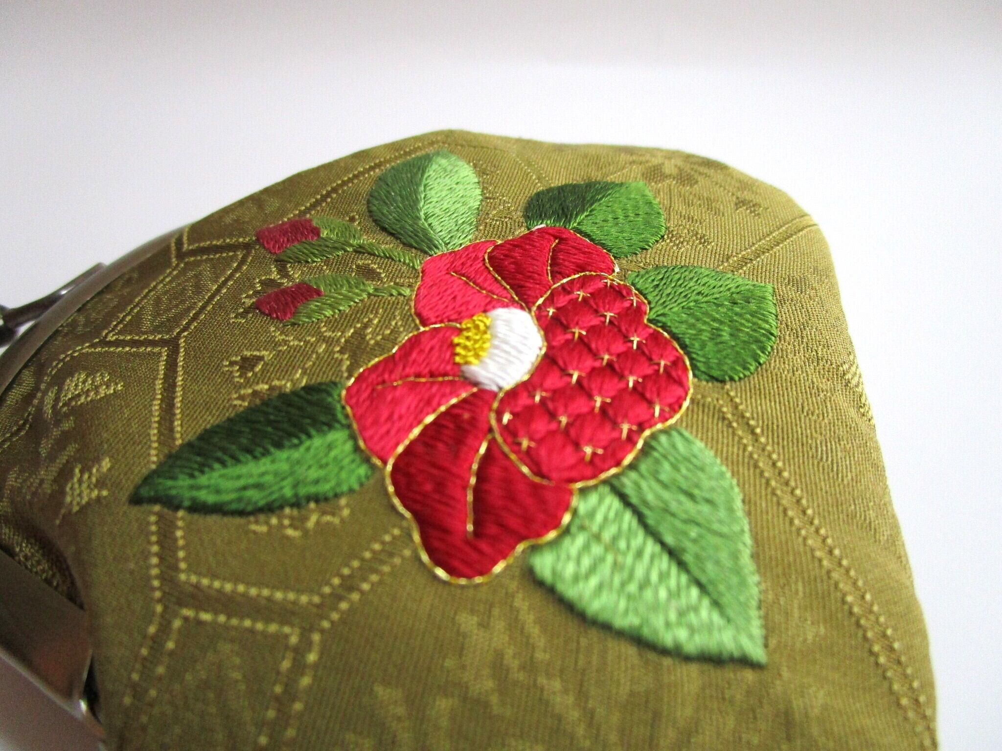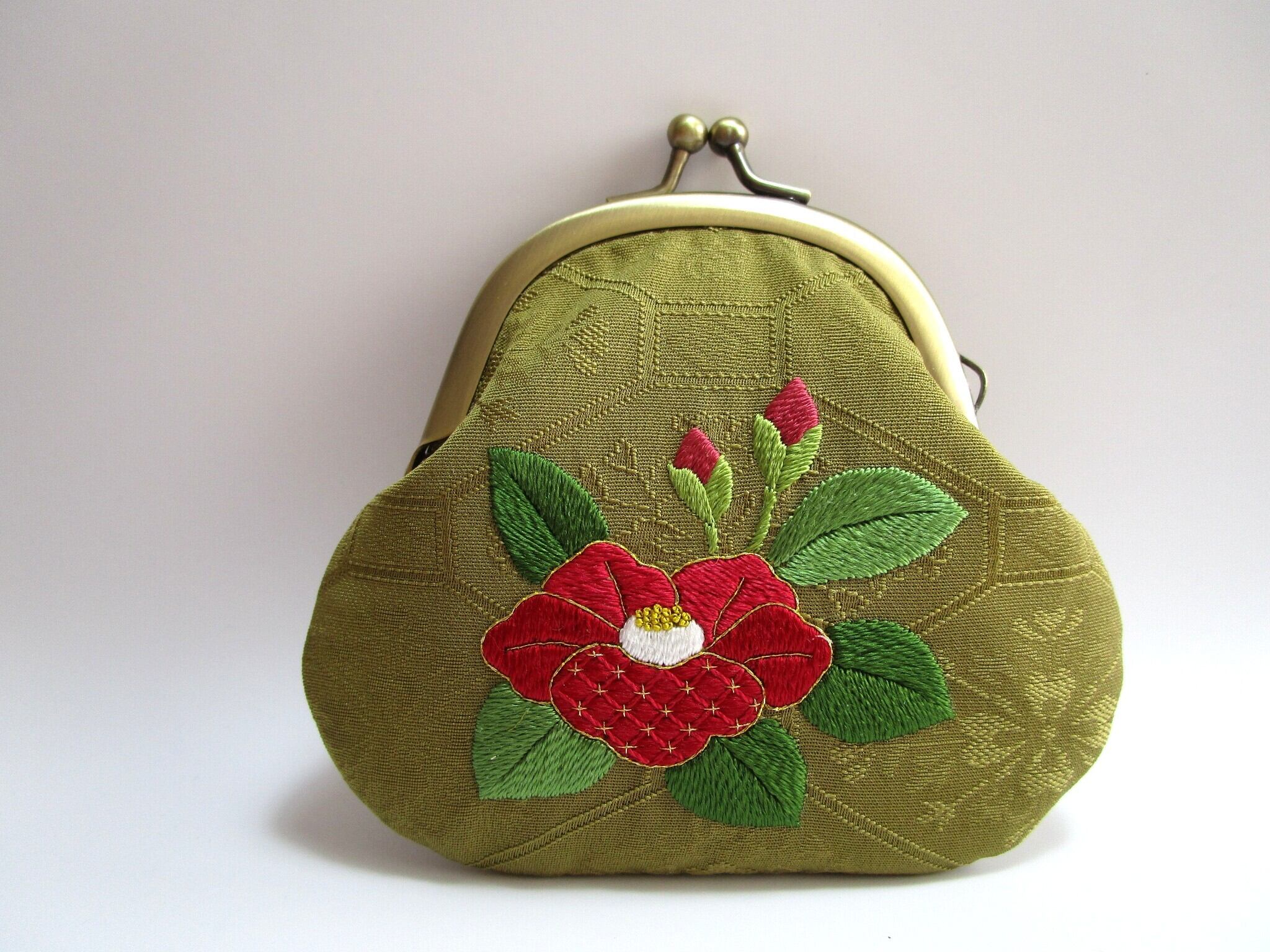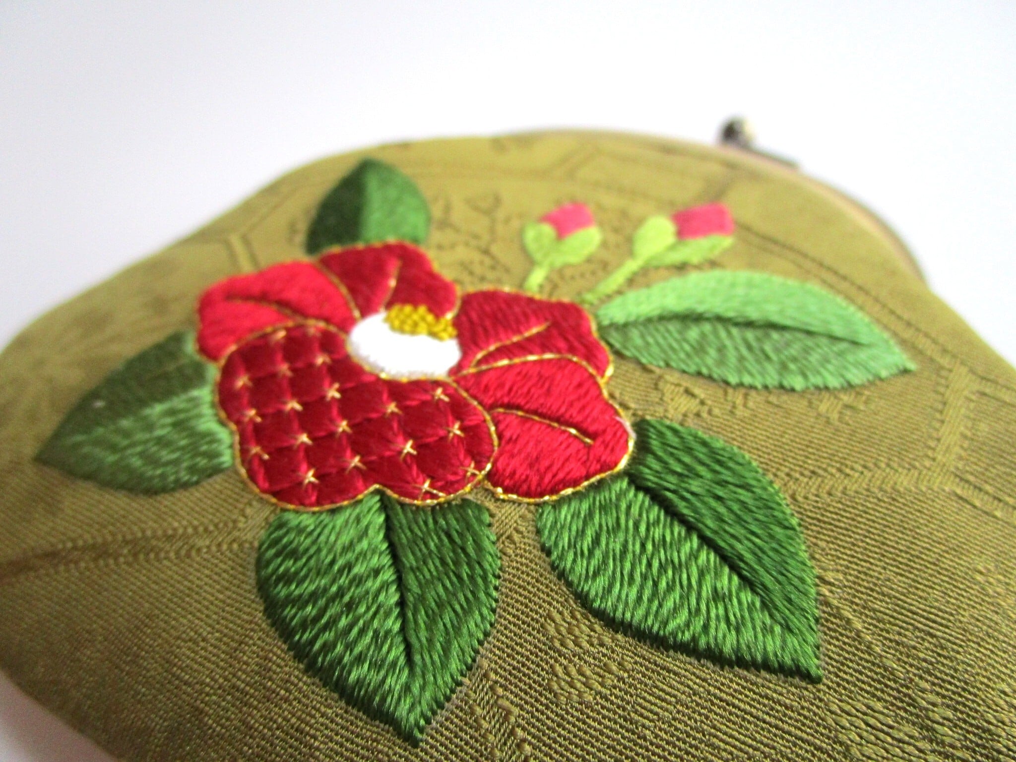 『日本刺繡 』*赤椿*がま口 小銭入れ・キーケース◆鶯色*レッド◆