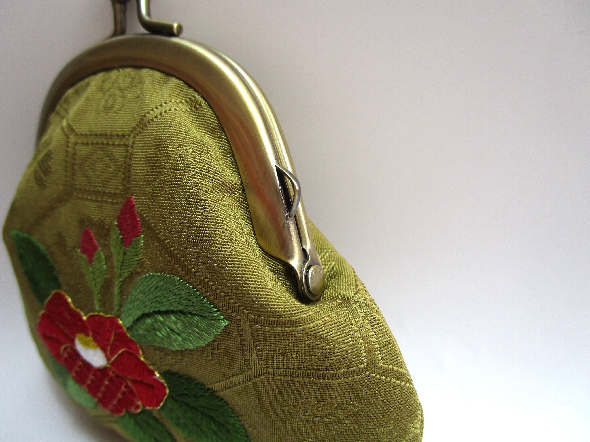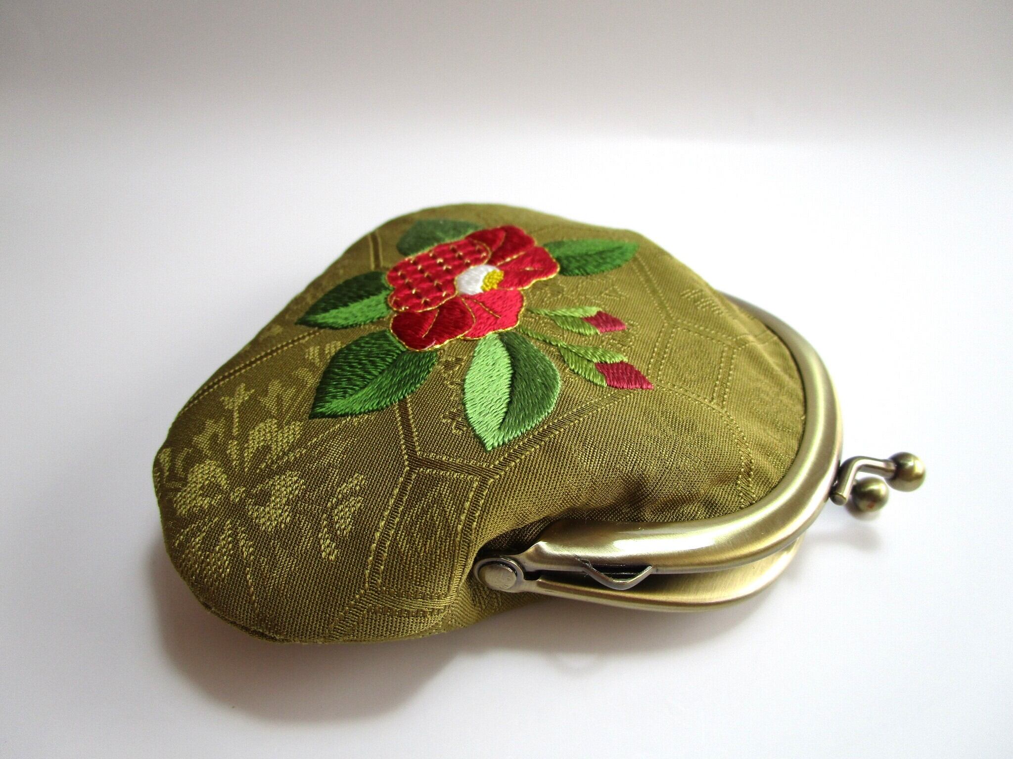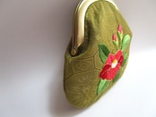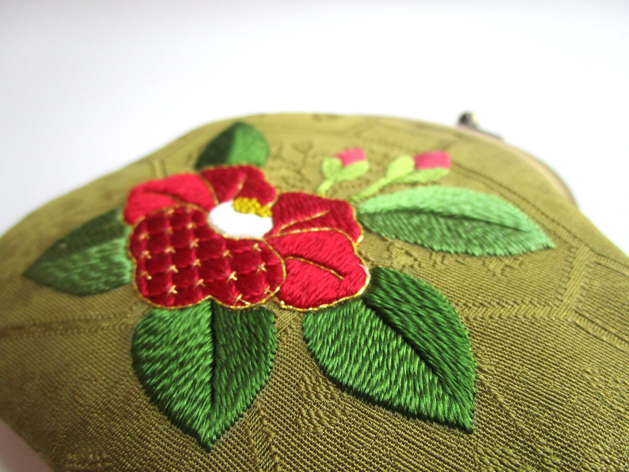 『日本刺繡 』*赤椿*がま口 小銭入れ・キーケース◆鶯色*レッド◆