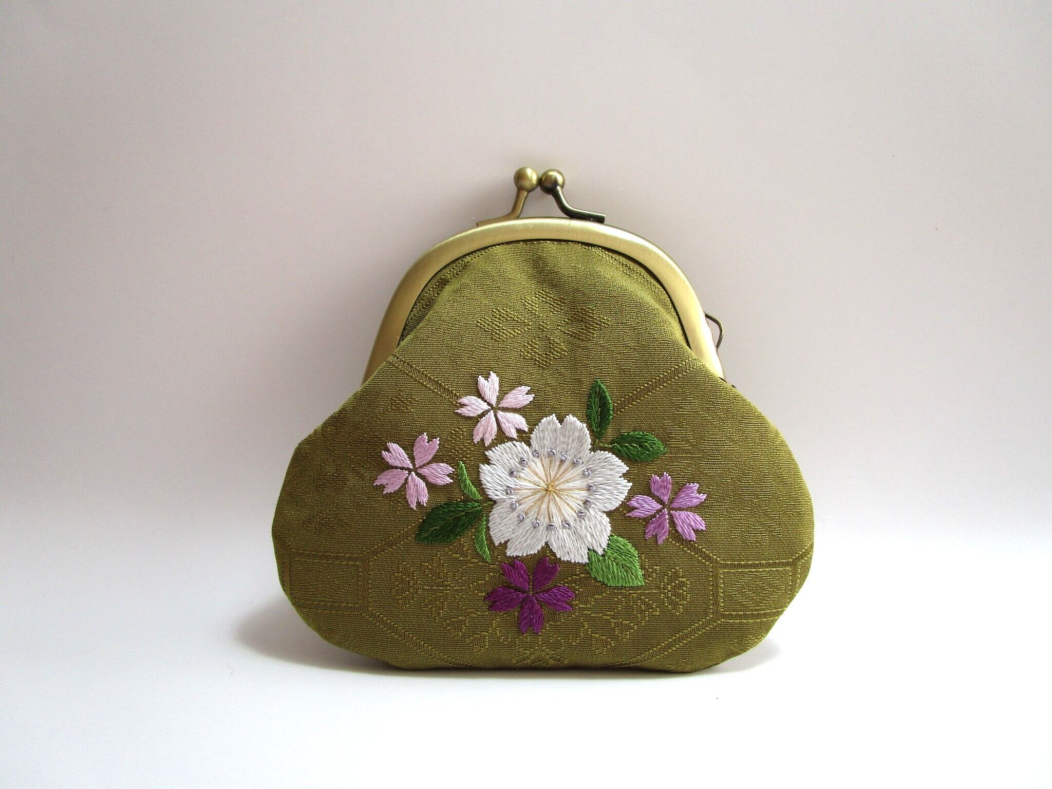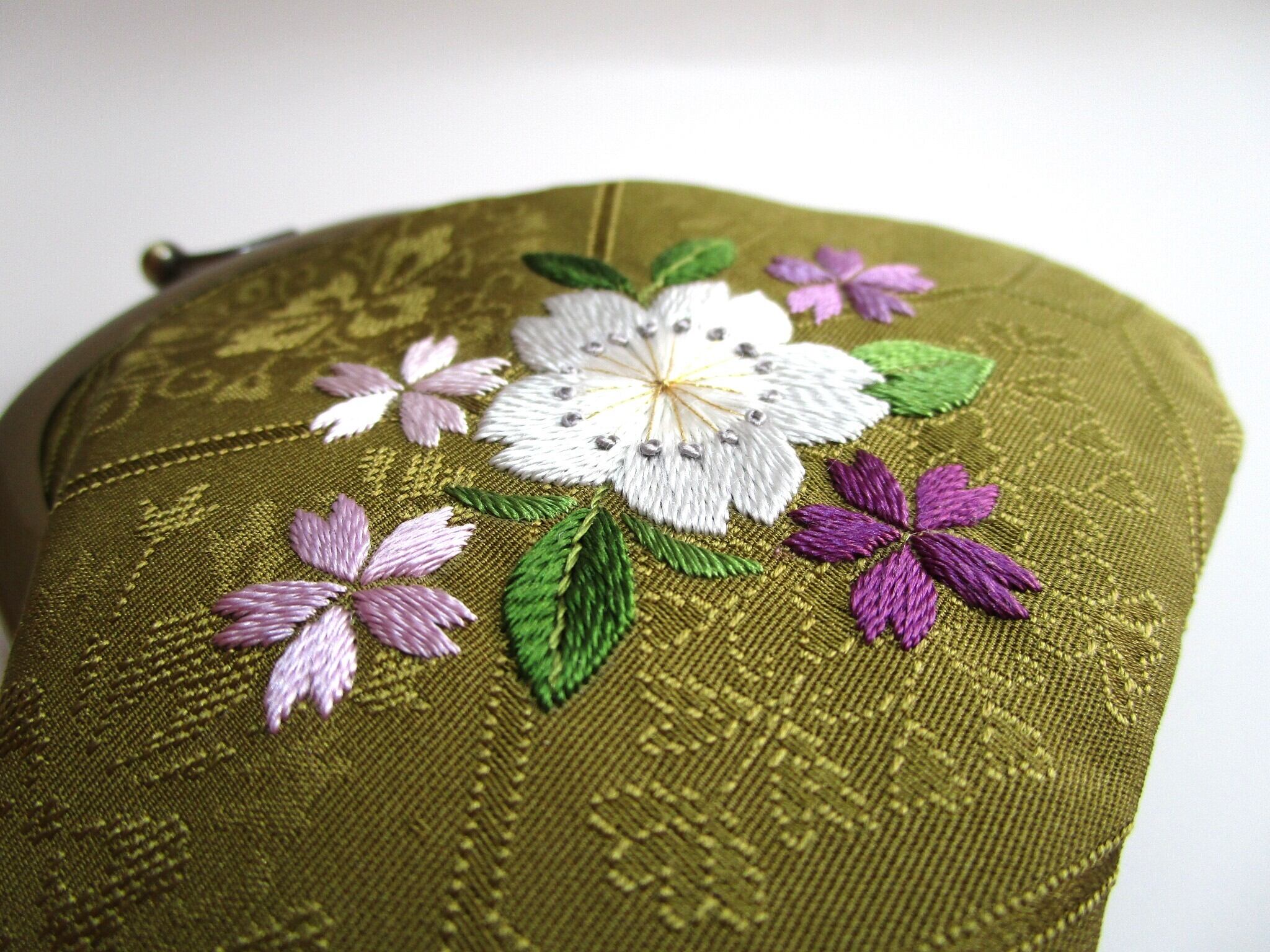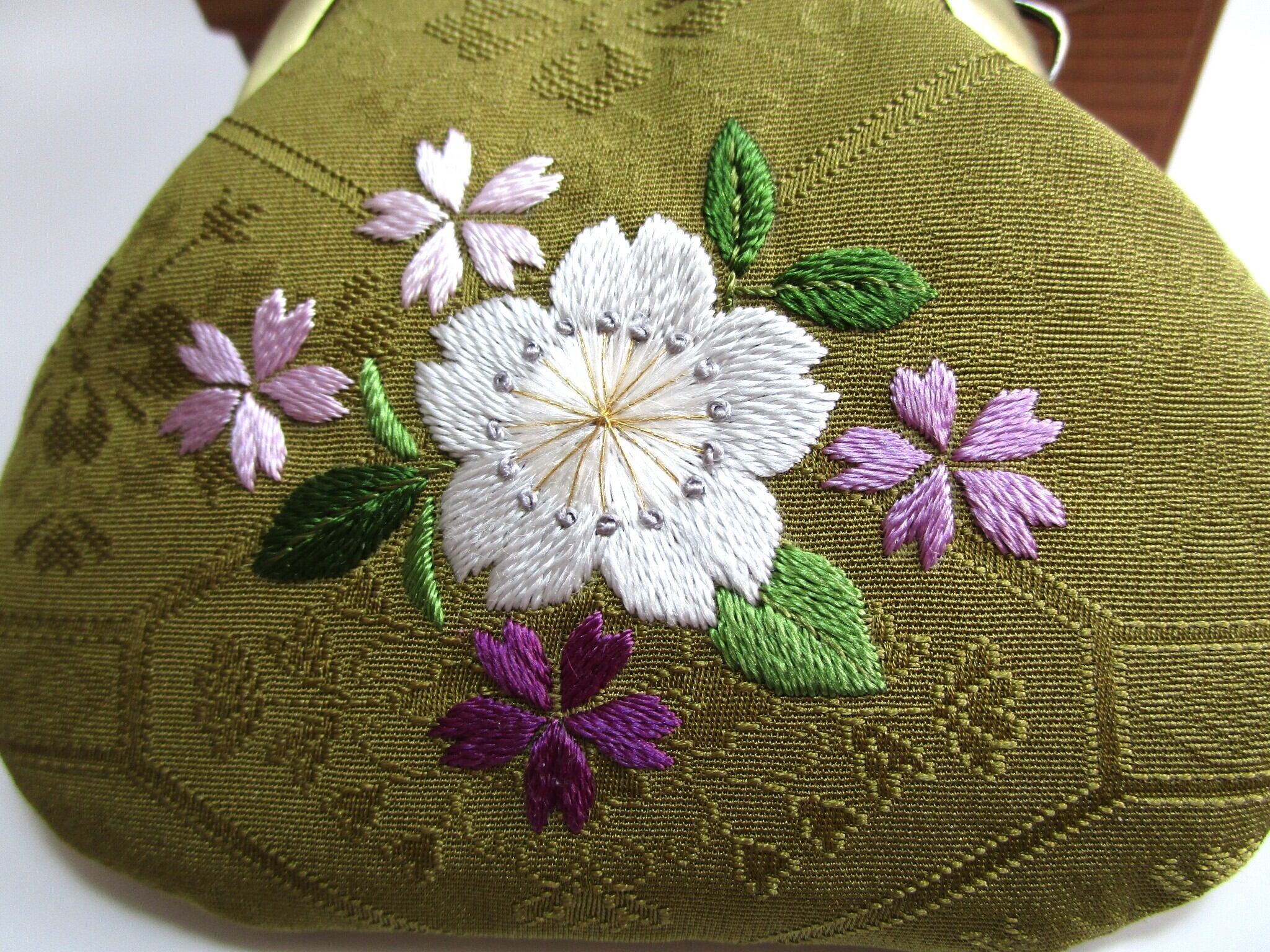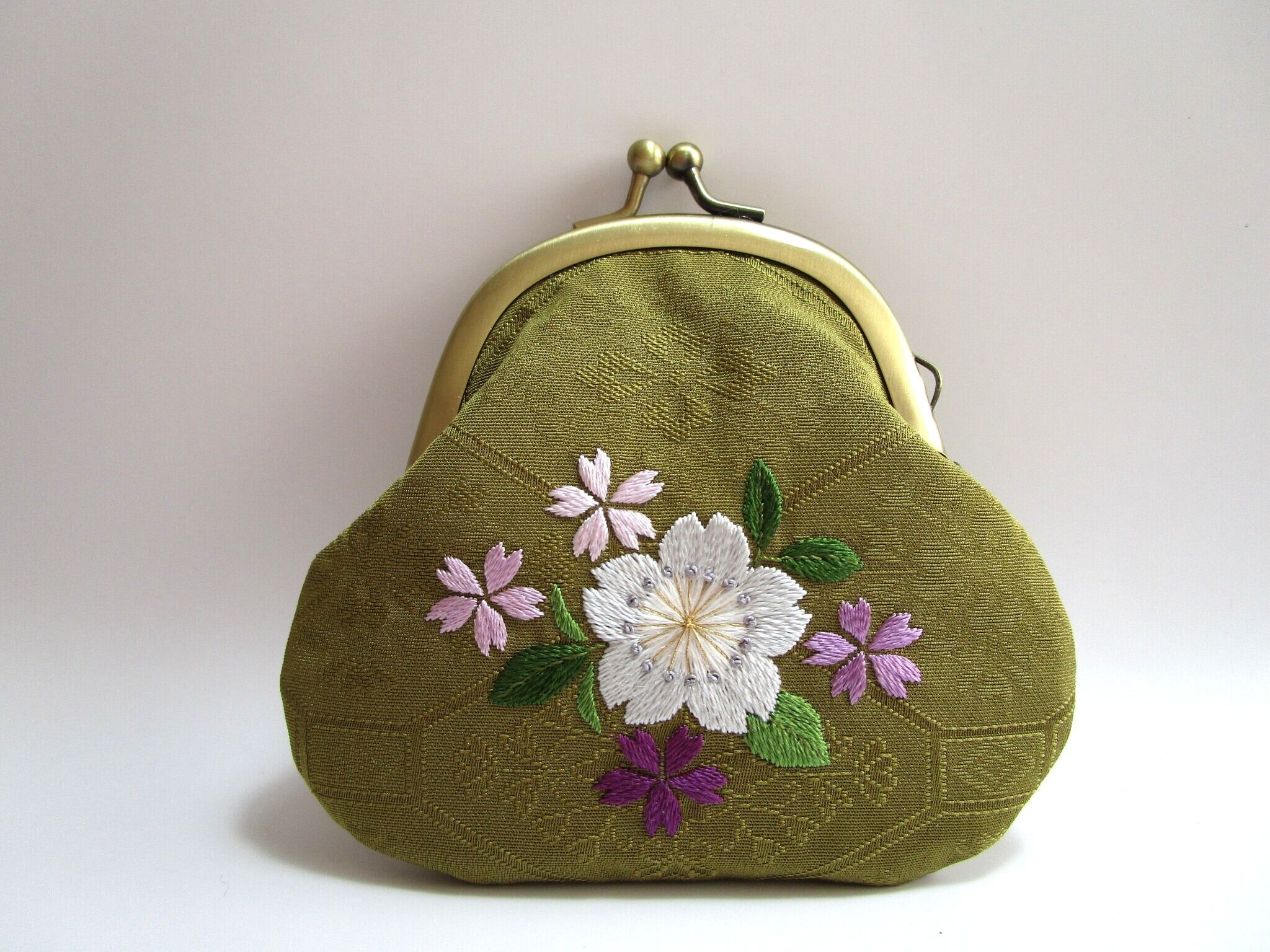『日本刺繡 』*桜の花*がま口 小銭入れ・キーケース◆鶯色*パステルカラー◆