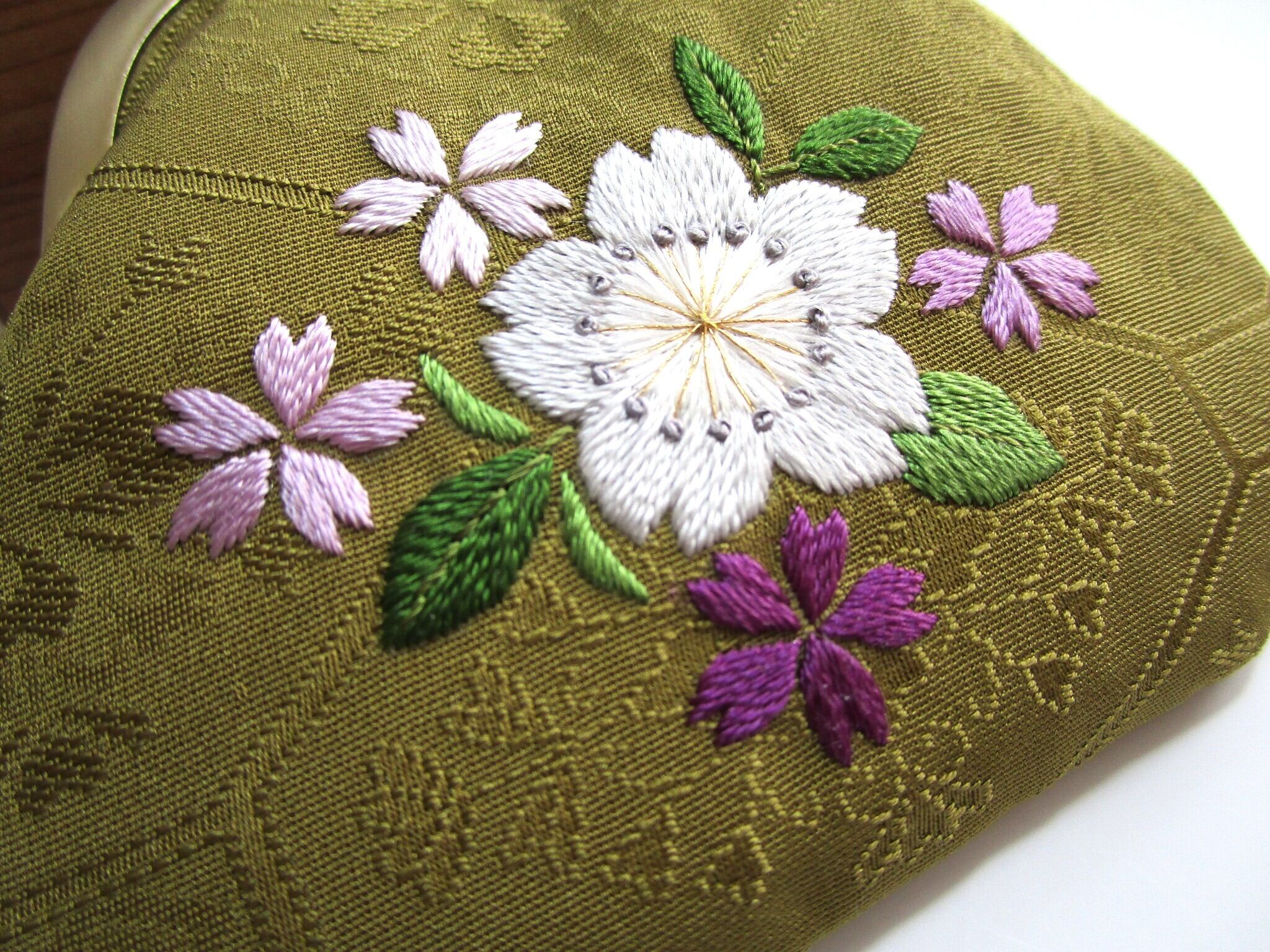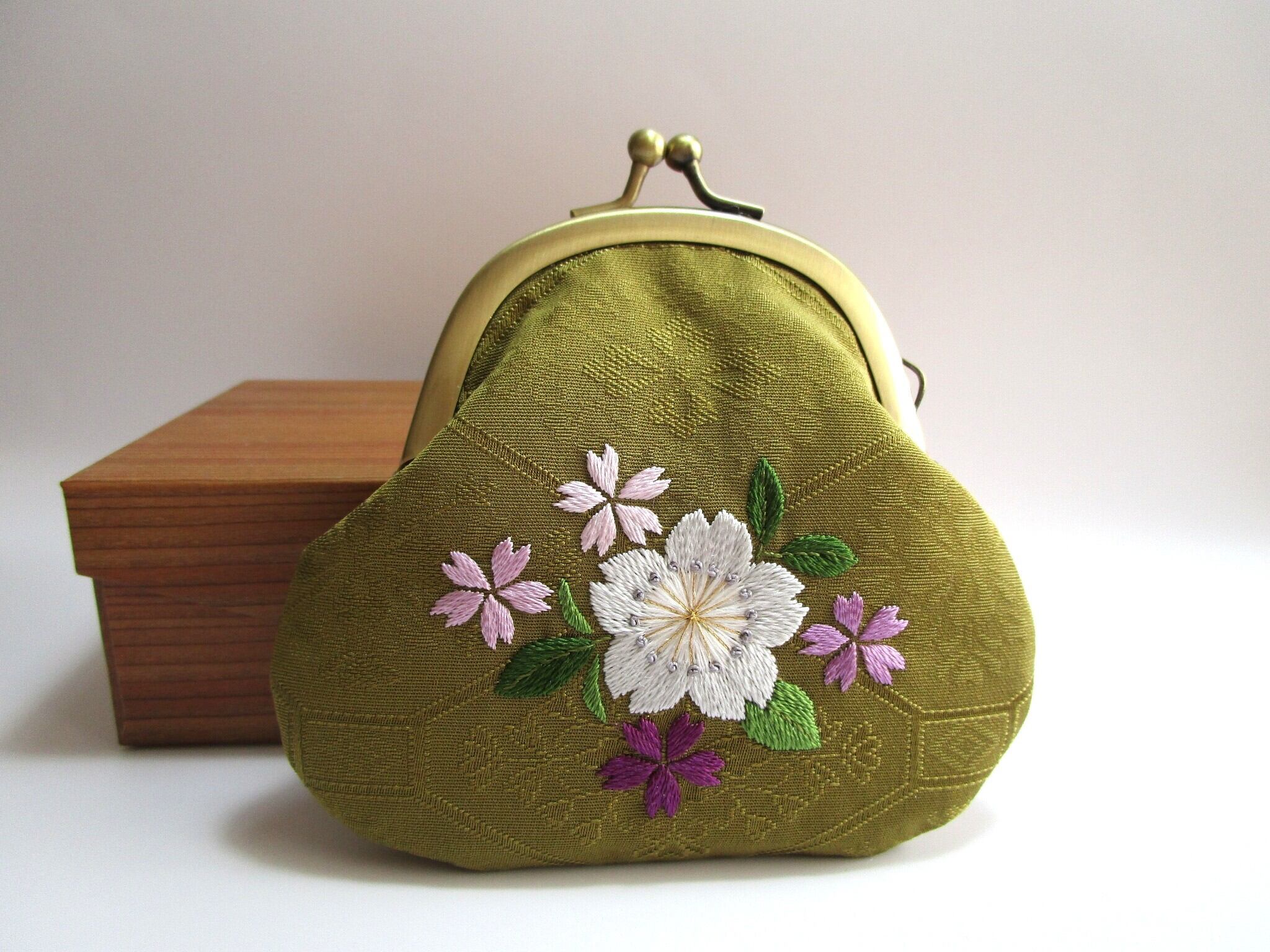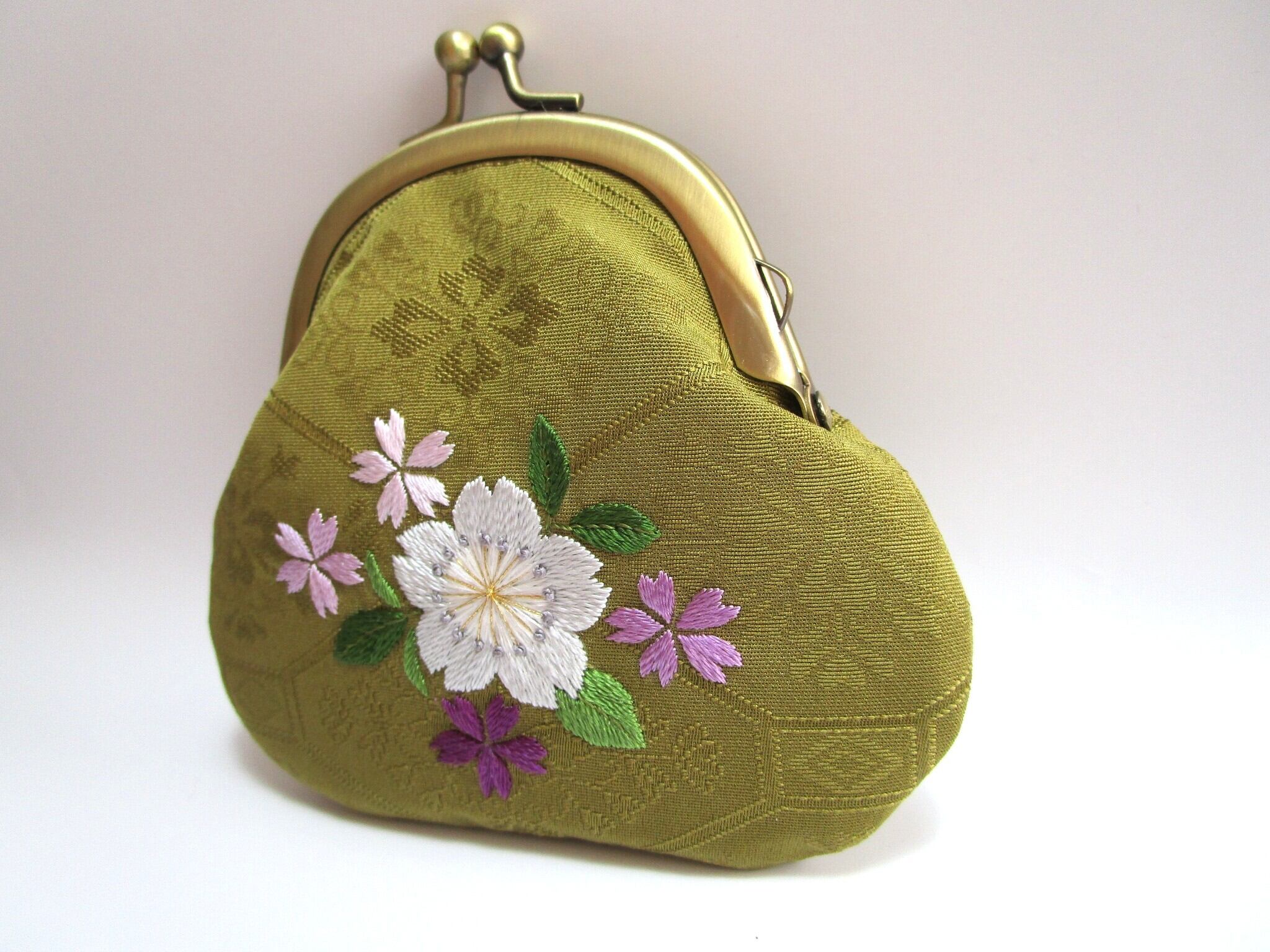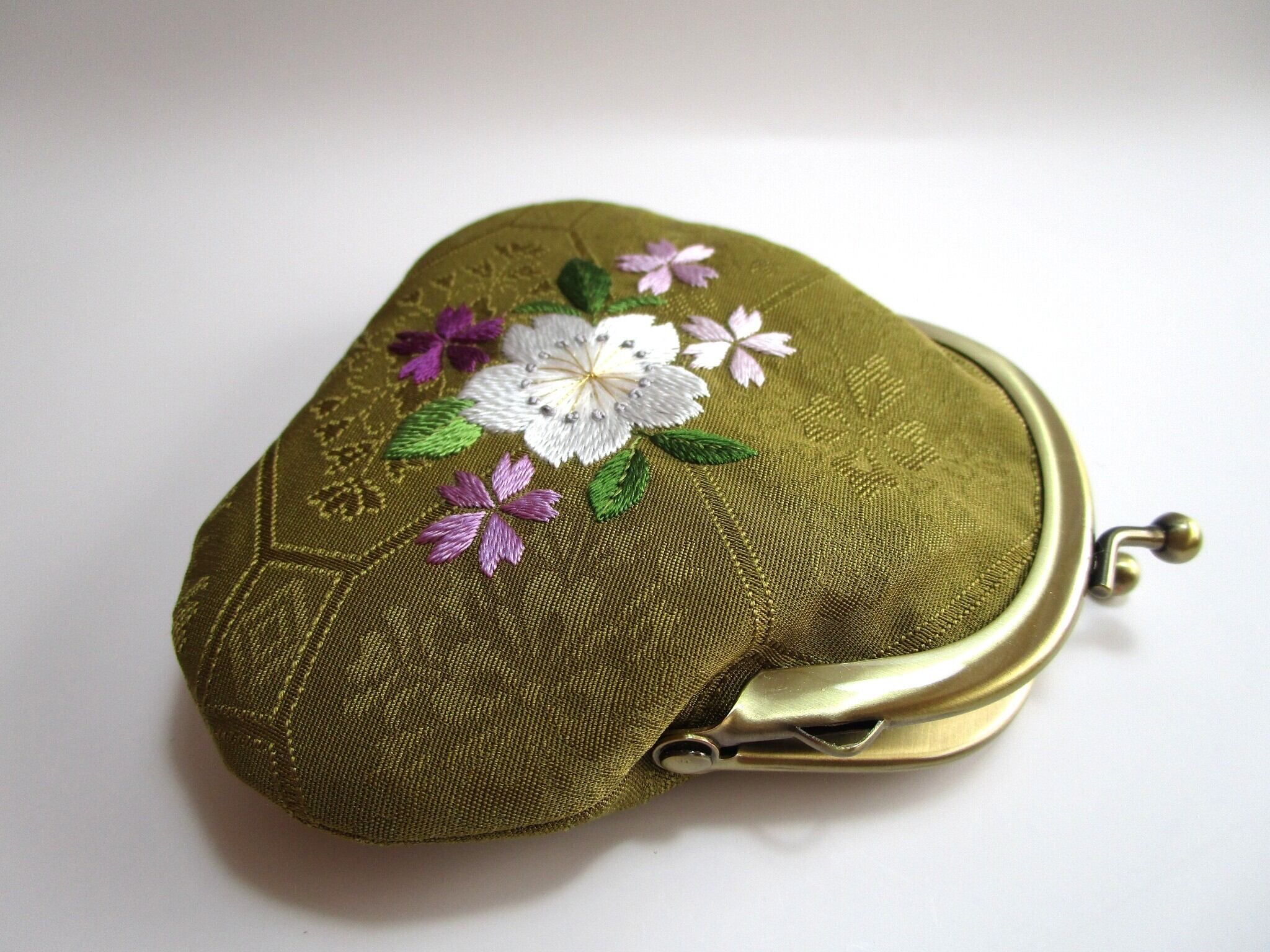 『日本刺繡 』*桜の花*がま口 小銭入れ・キーケース◆鶯色*パステルカラー◆