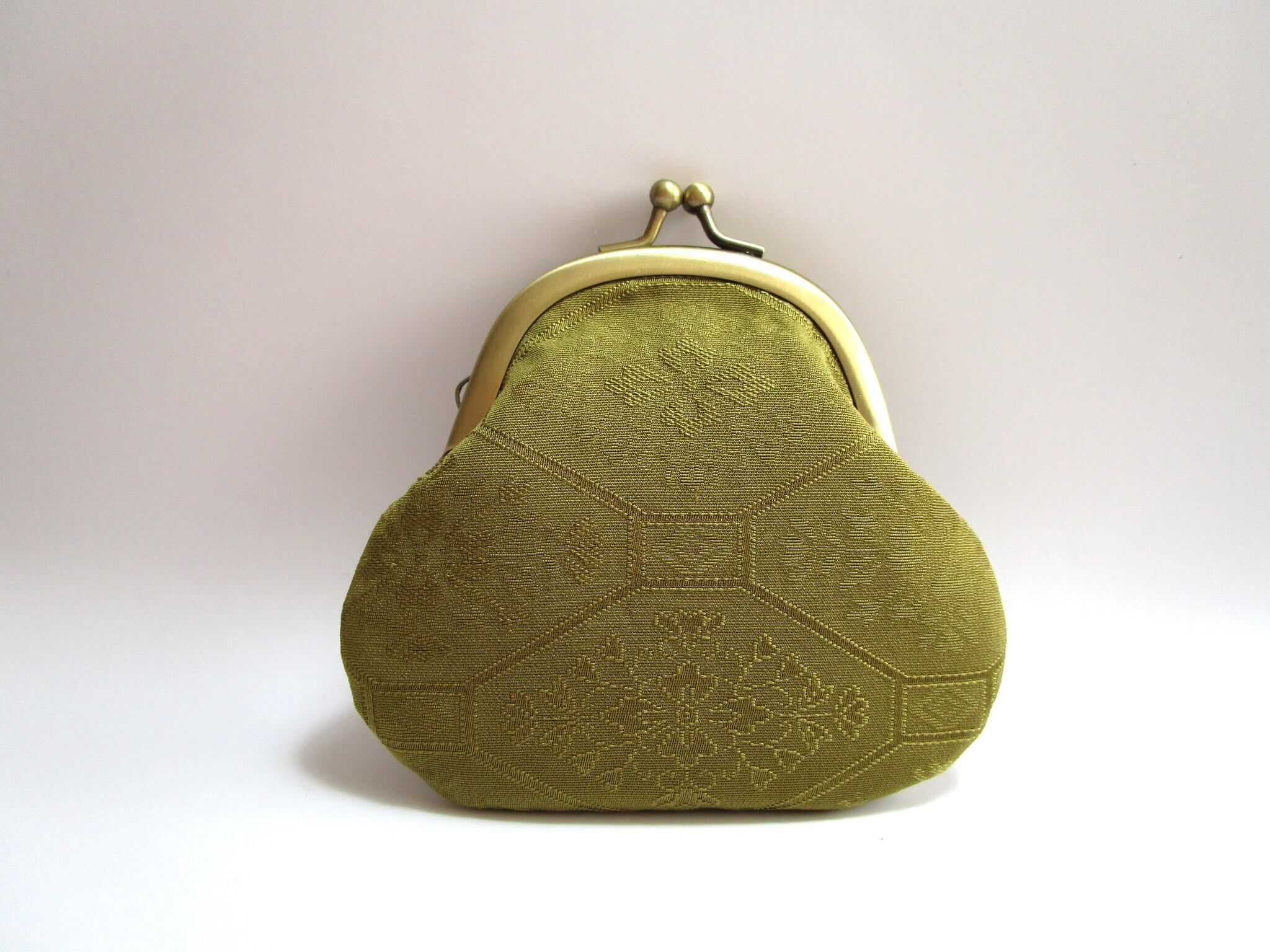 花亀甲の織紋様の着物生地の鶯色とライトグレーと紫色の絹糸が織りなすシックな桜の花に仕上げましたこのがま口は、日常を華やかに彩るアイテムとなっています。