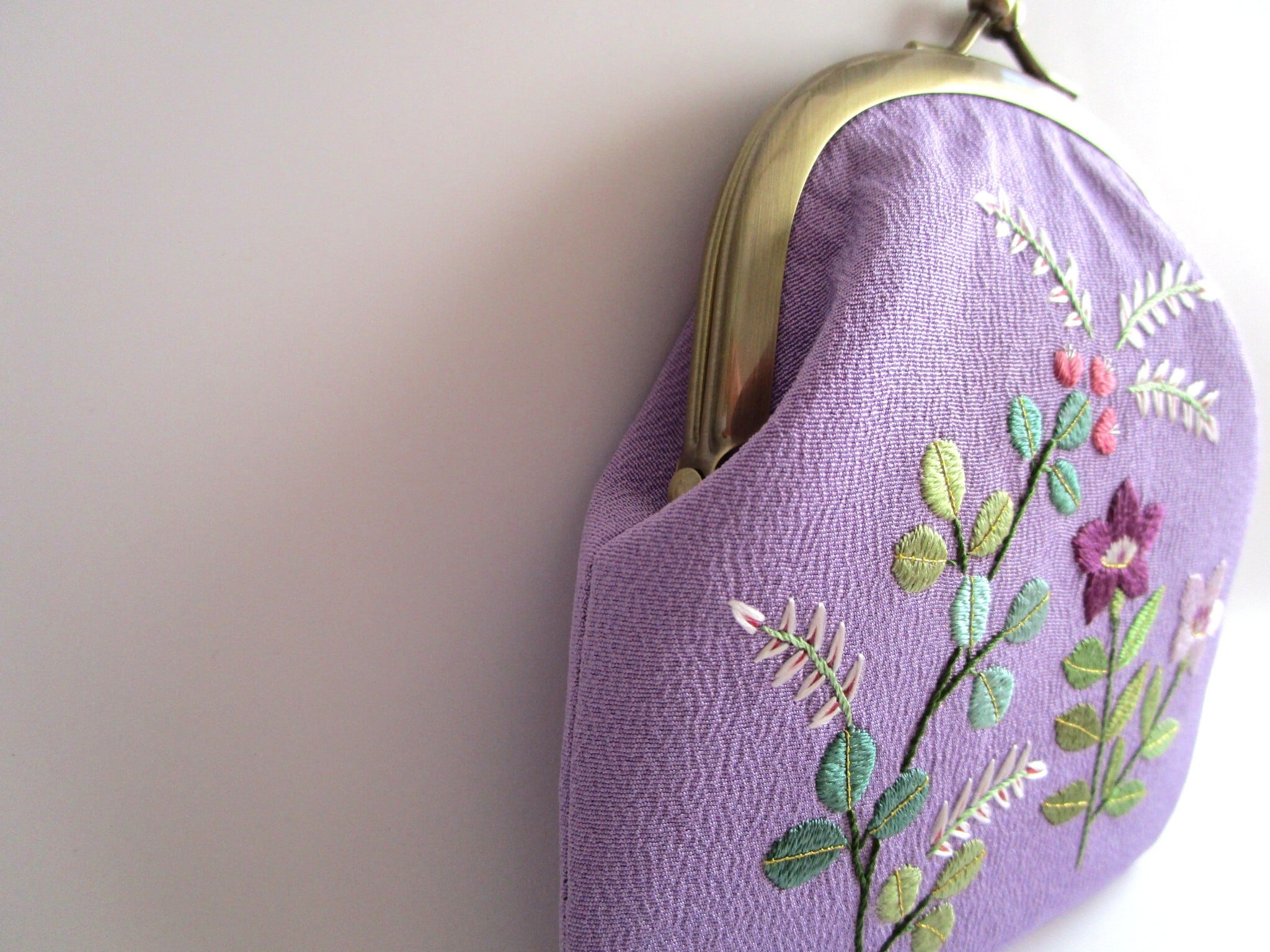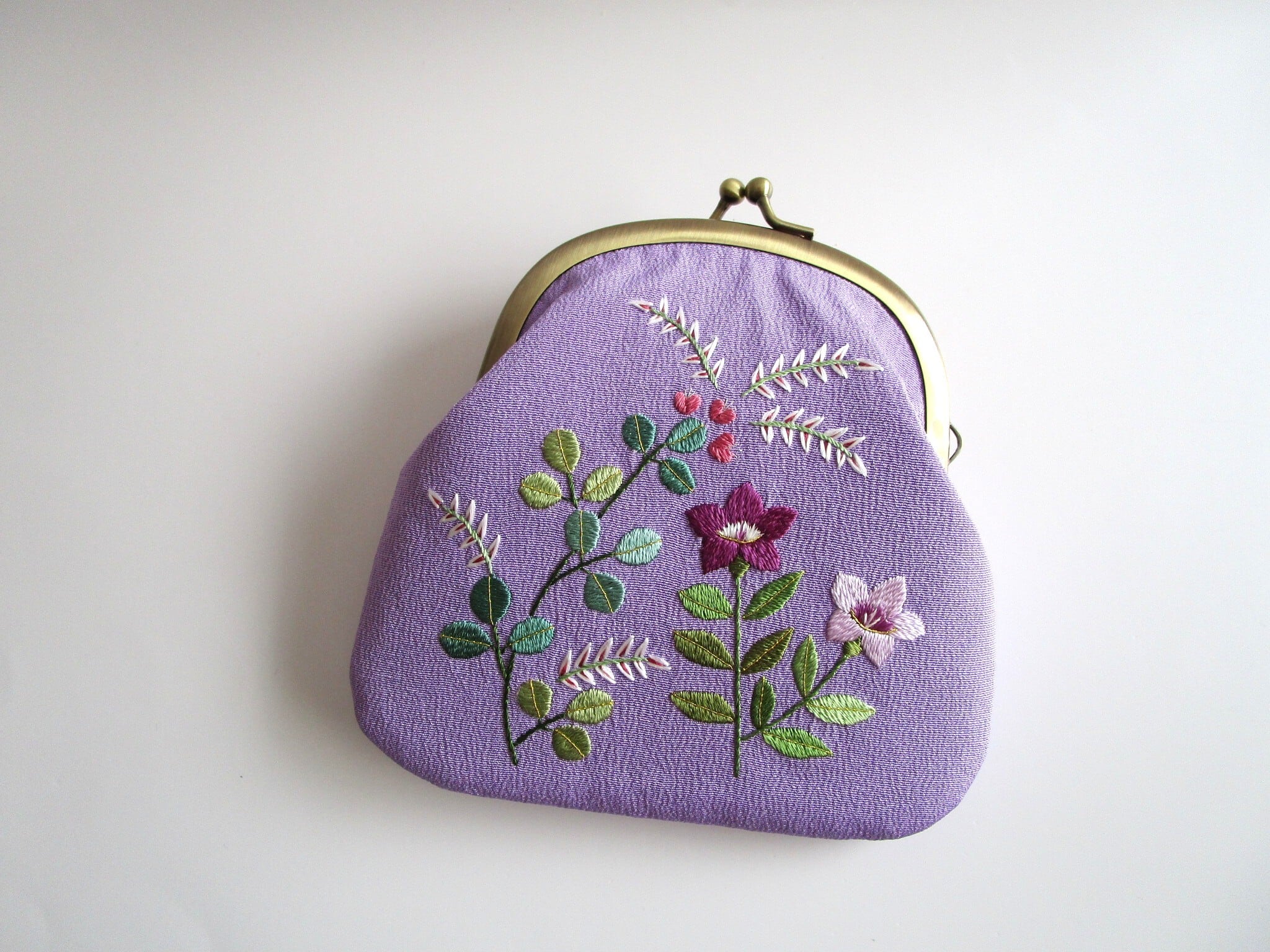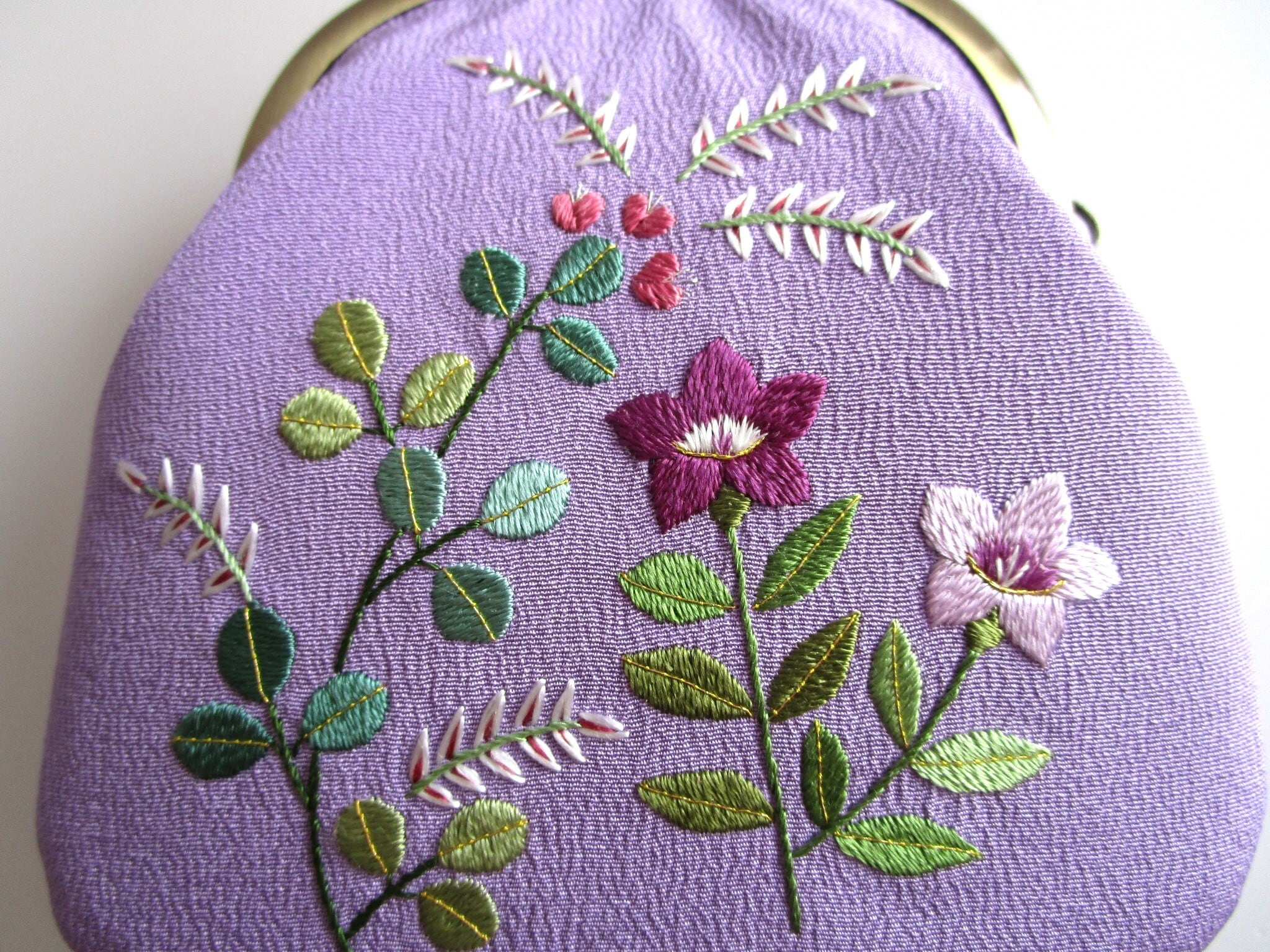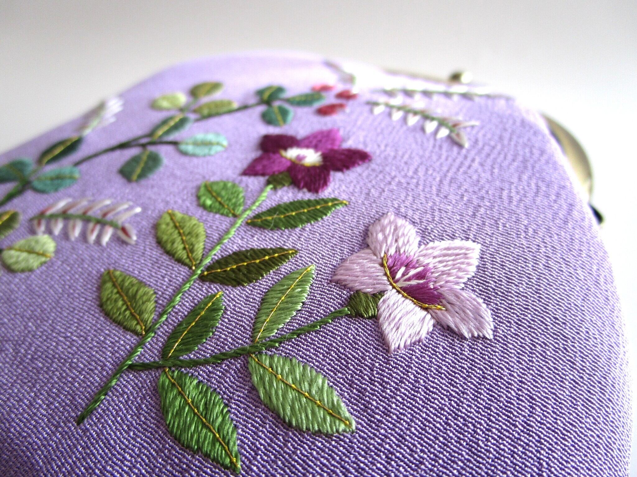 『日本刺繡 』*桔梗と萩*がま口ポーチ・化粧ポーチ◆ラベンダー*紫◆