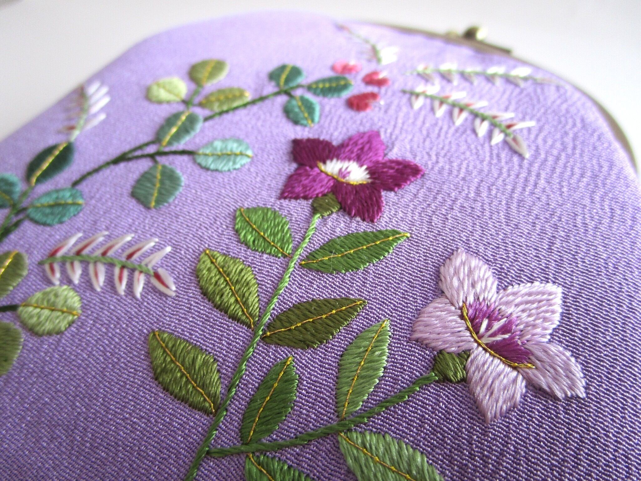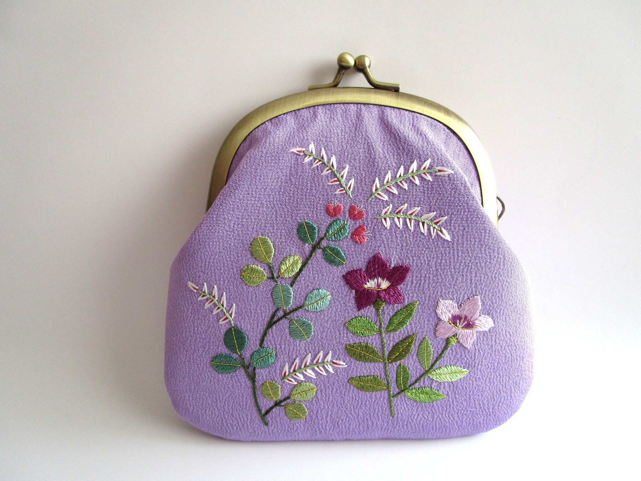 日本刺繡の技術を活かした『桔梗と萩』デザインのがま口ポーチ・化粧ポーチです。