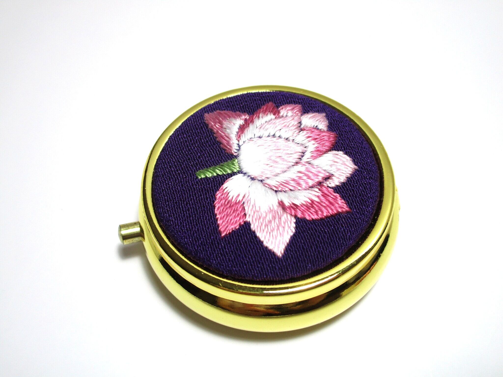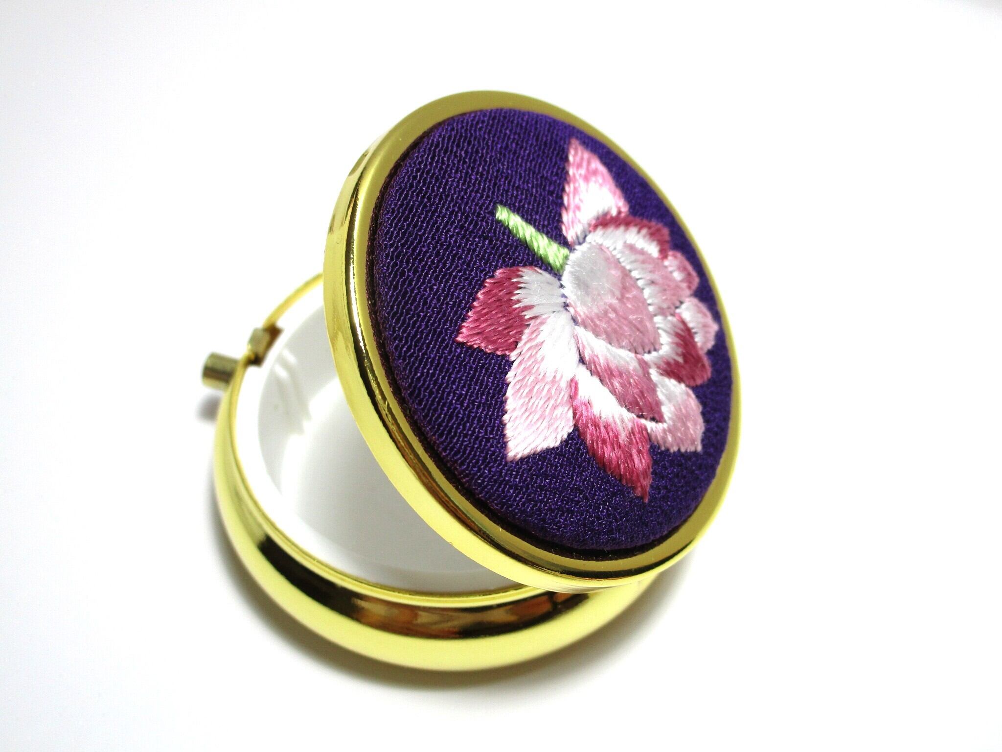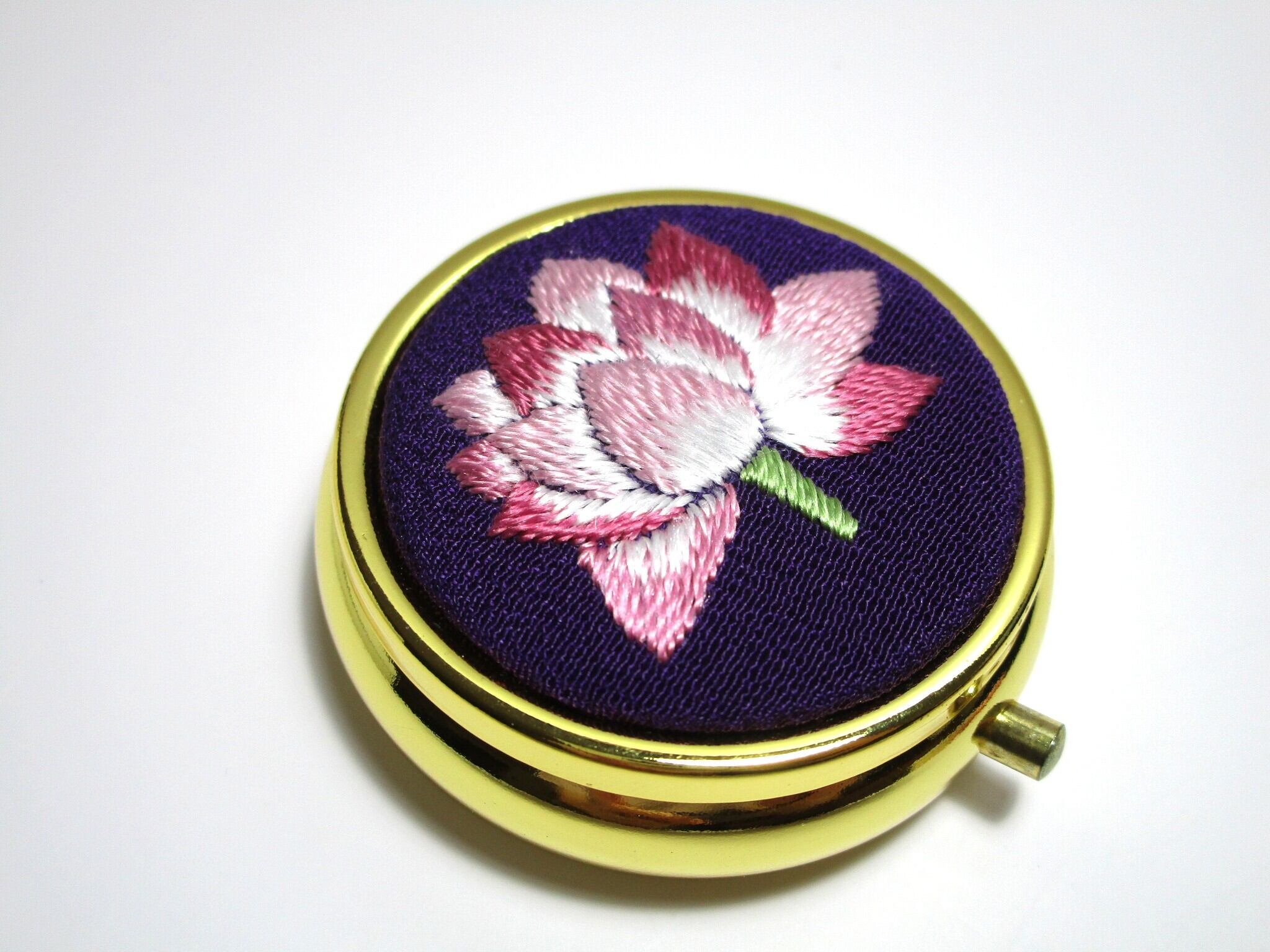 日本刺繡の技術を活かした『蓮の花』デザインのアクセサリーケース(ミラー付き)です。