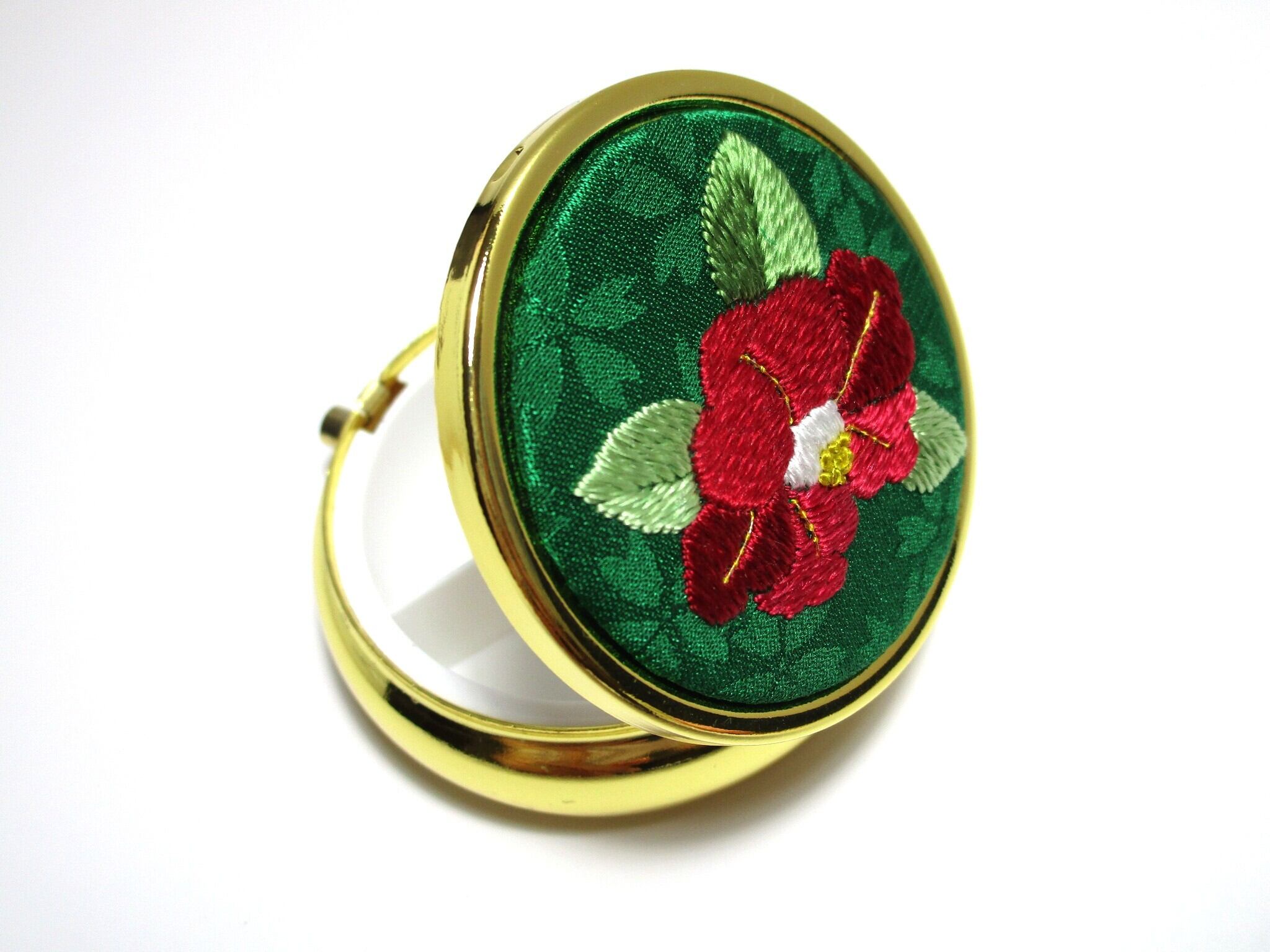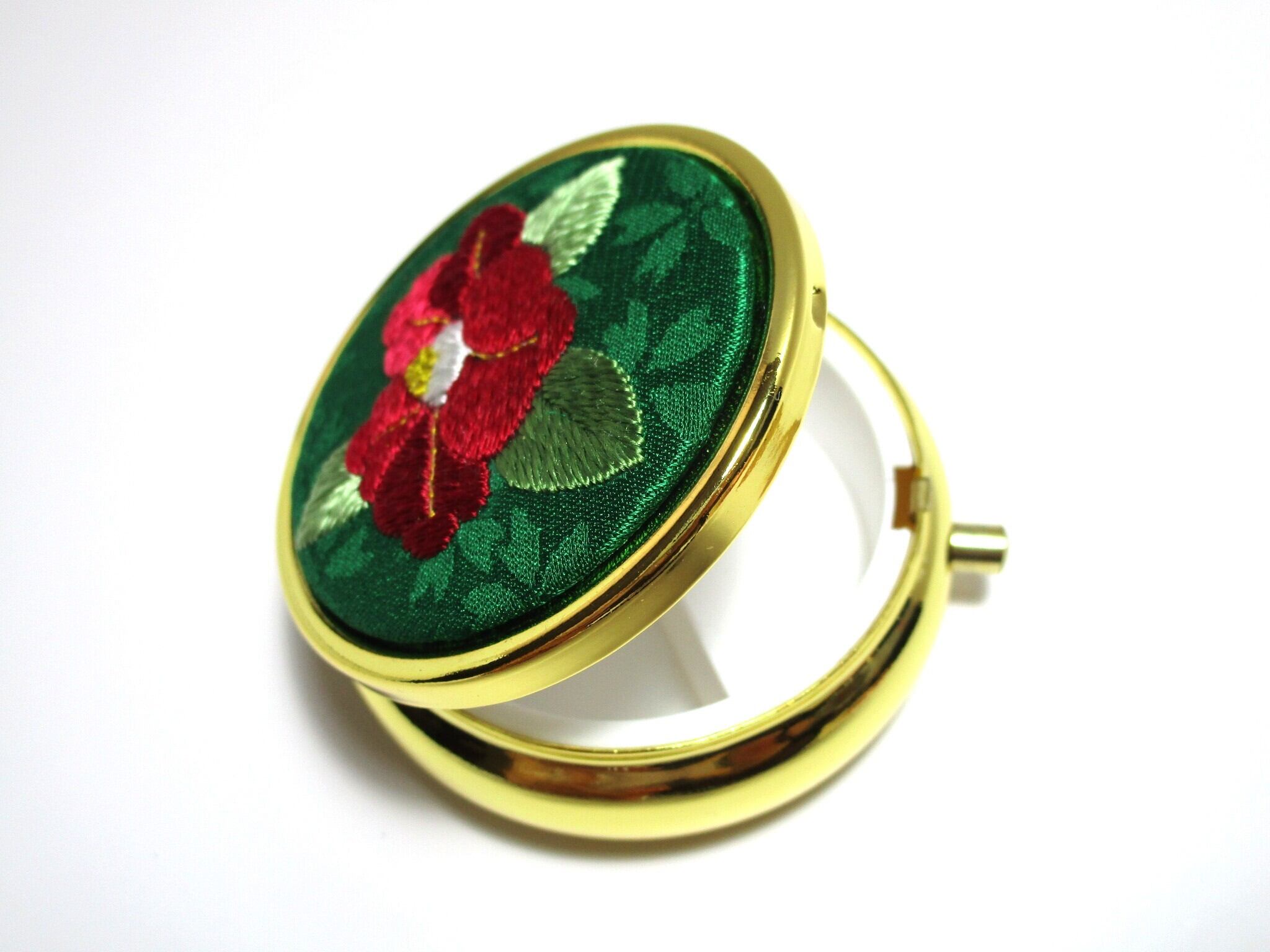 『日本刺繡』*赤椿* アクセサリーケース(ミラー付き)/間仕切りあり◆グリーン*レッド◆