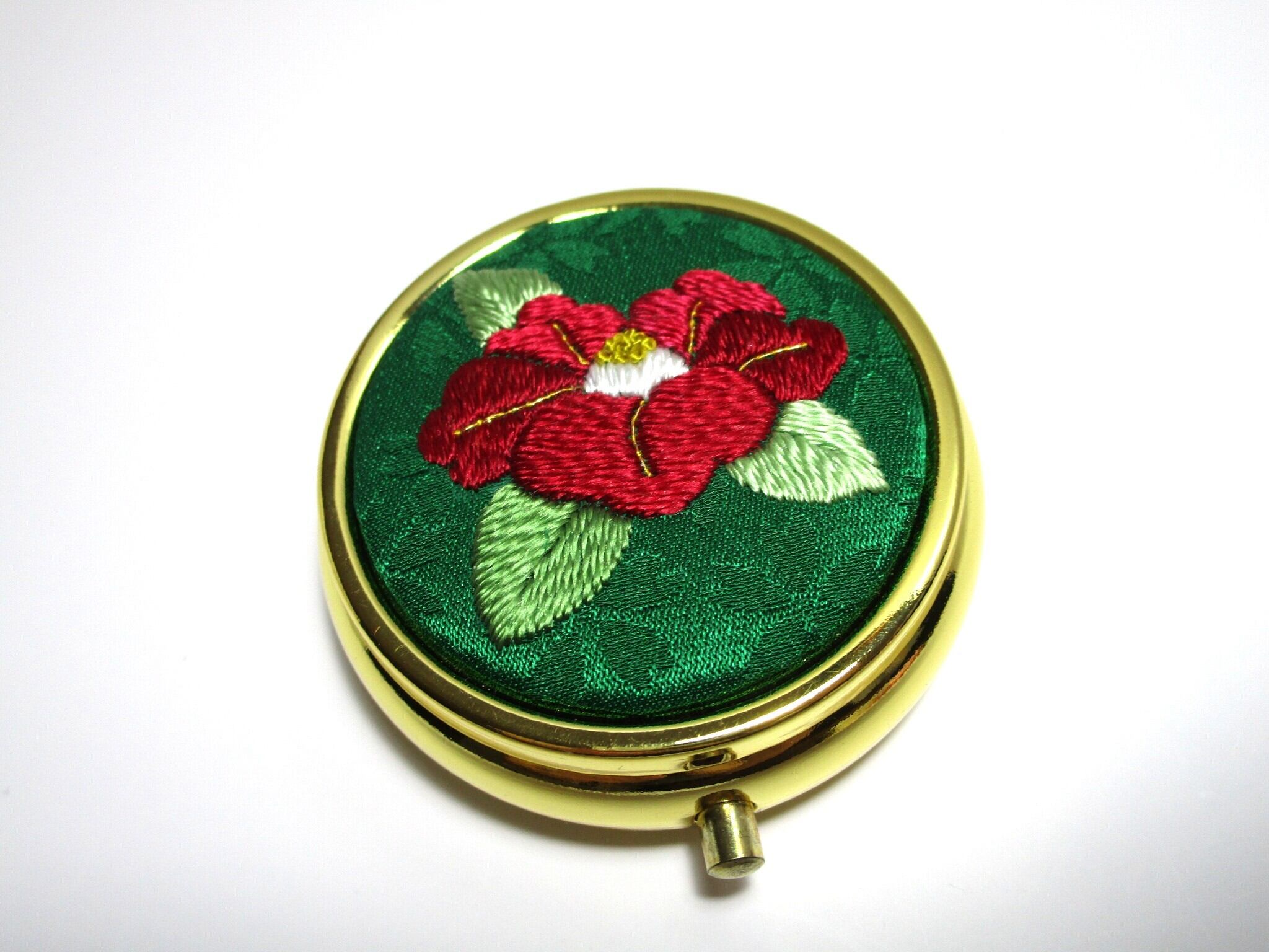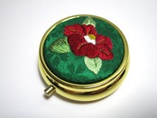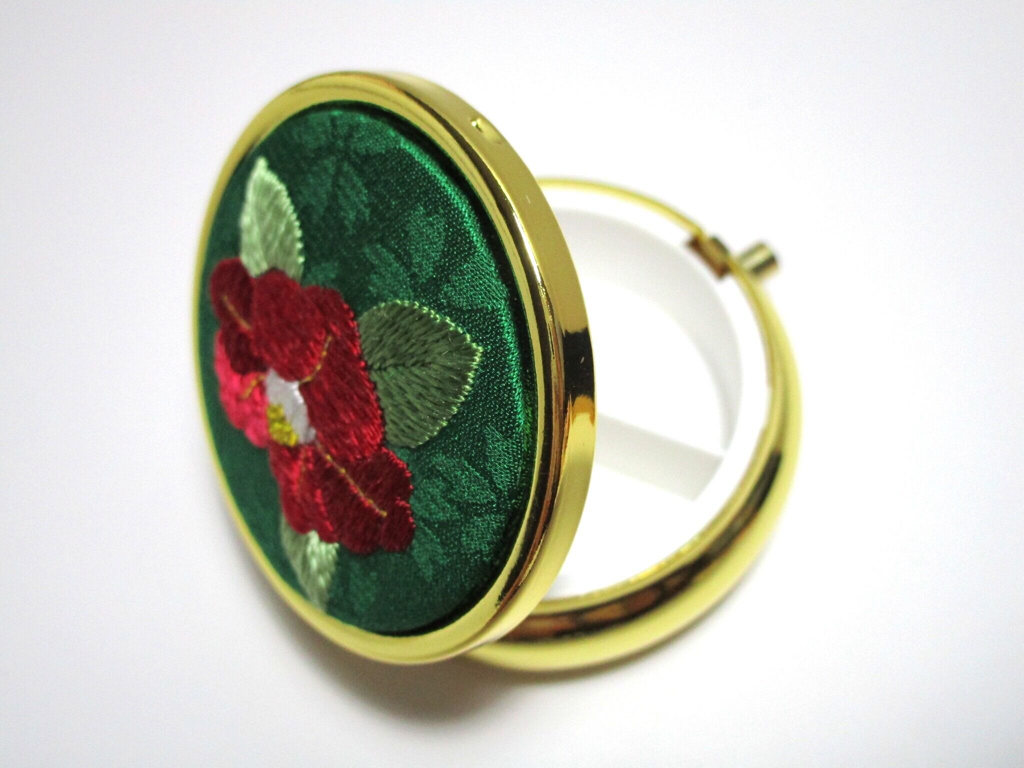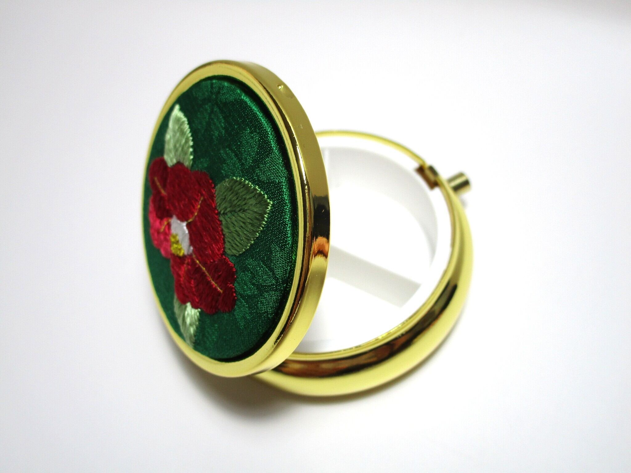 日本刺繡の技術を活かした『赤椿』デザインのアクセサリーケース(ミラー付き)です。