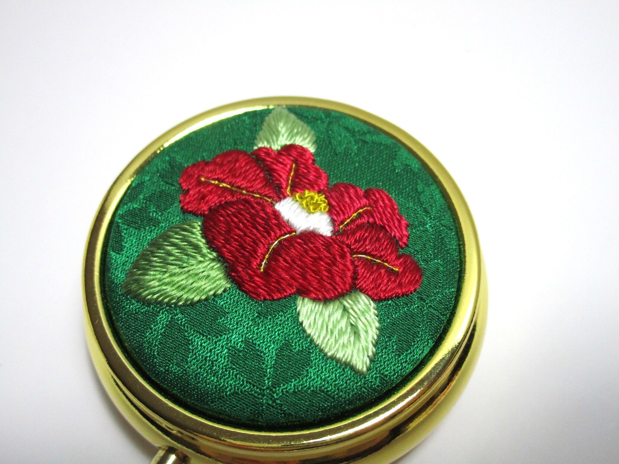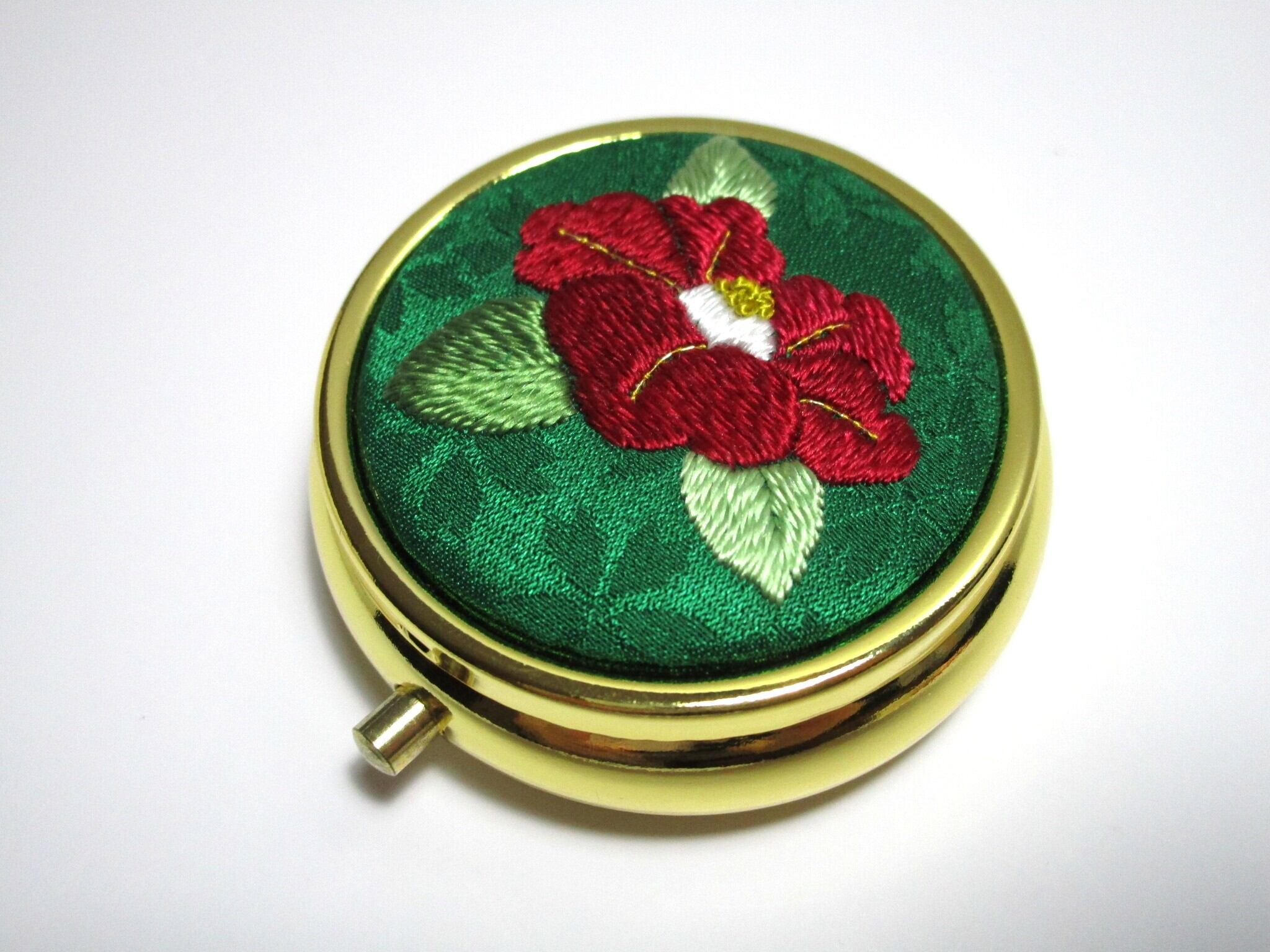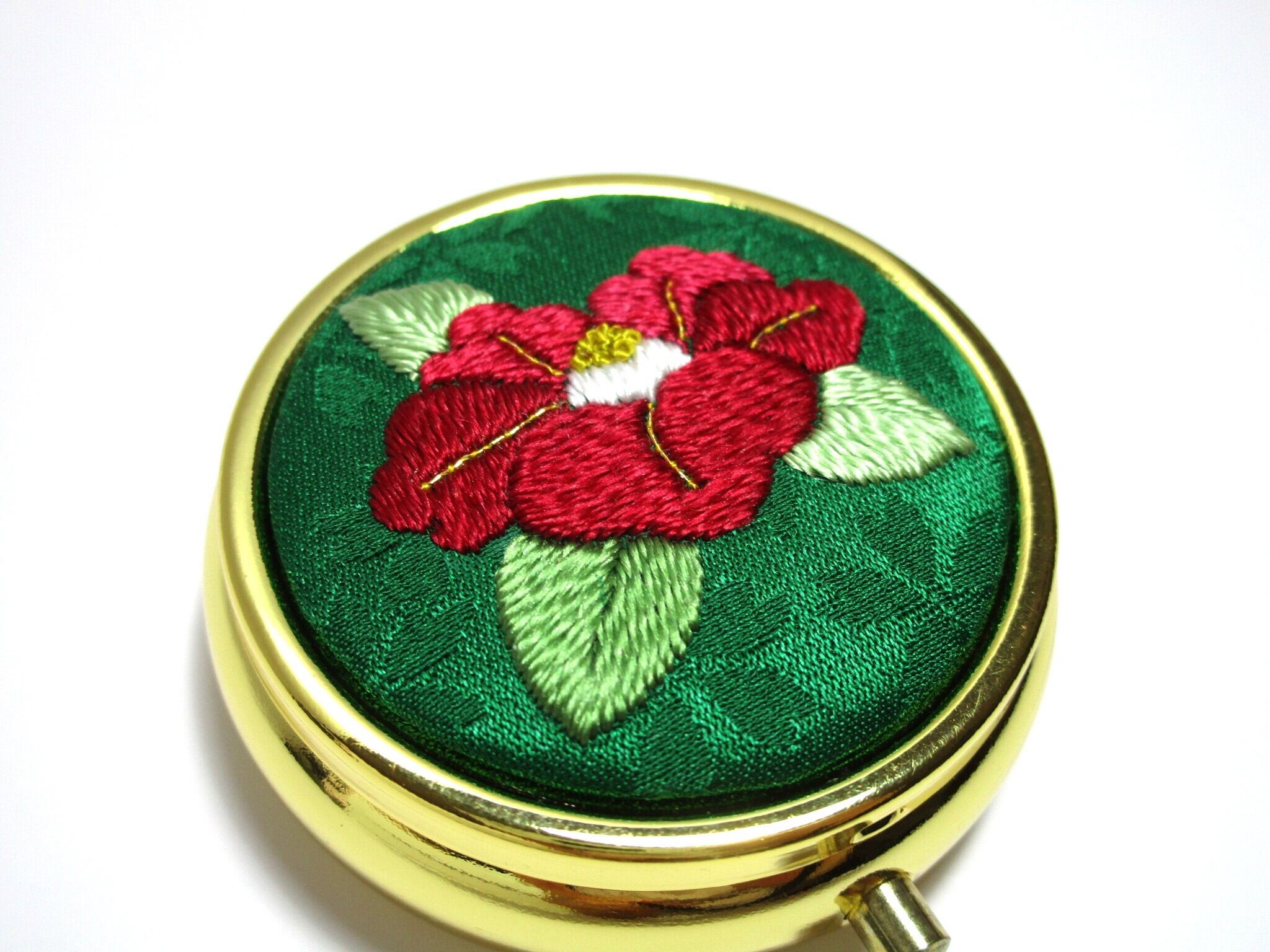 日本刺繡の技術を活かした『赤椿』デザインのアクセサリーケース(ミラー付き)です。
