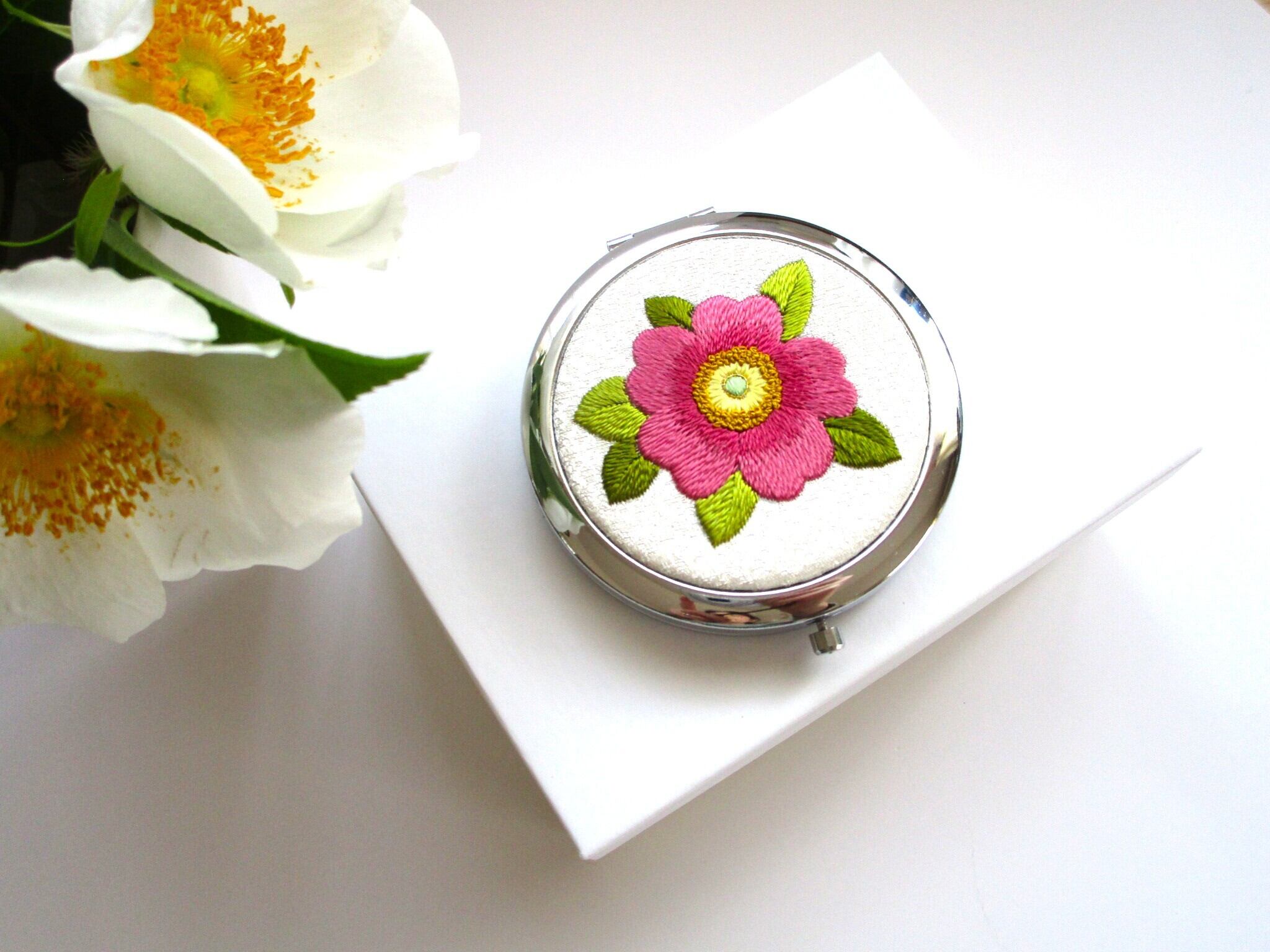 『日本刺繡』*薔薇*コンパクトミラー <シルバー> ◆オフホワイト*ピンク◆