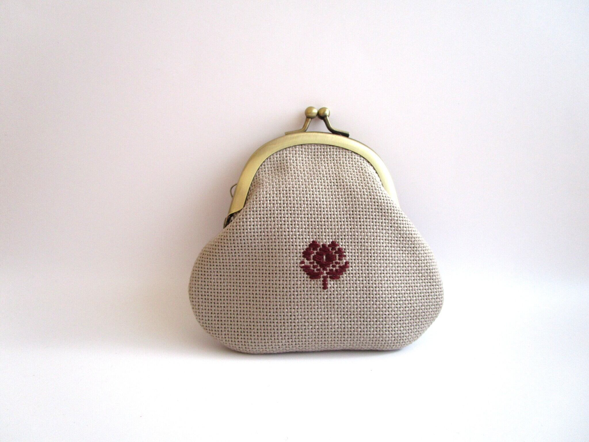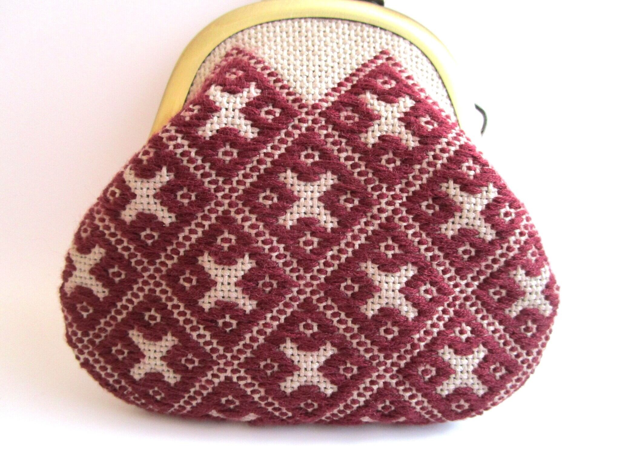 『こぎん刺し』✳️小枕✳️がま口 手のひらサイズ < 小銭入れ・ミニ財布 > ◆グレイベージュ*エンジ◆