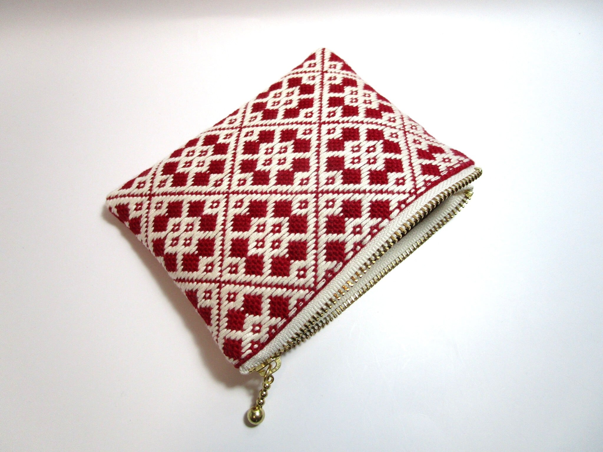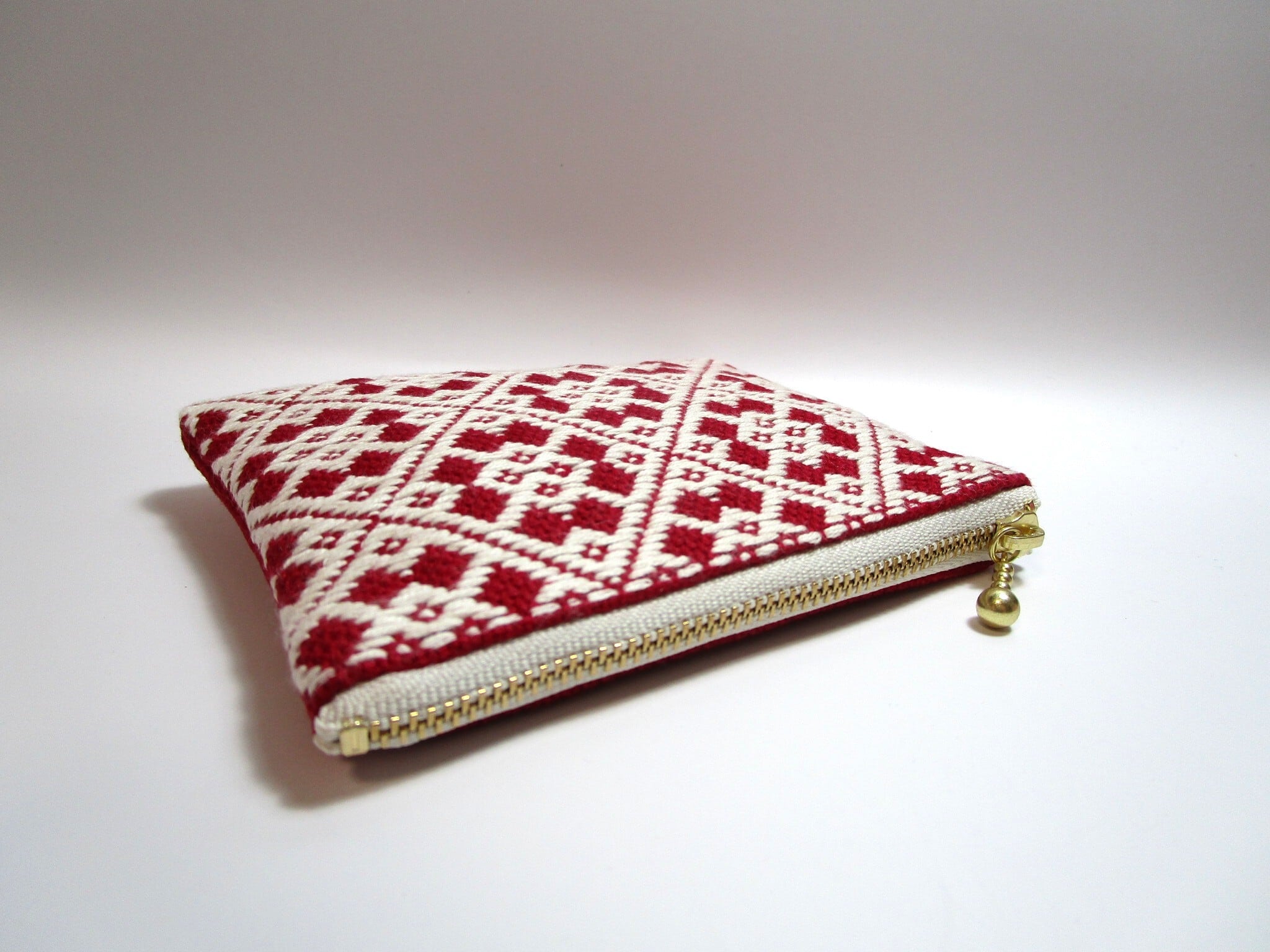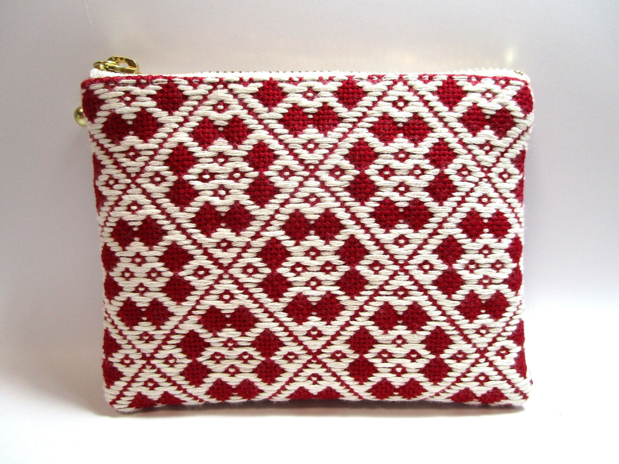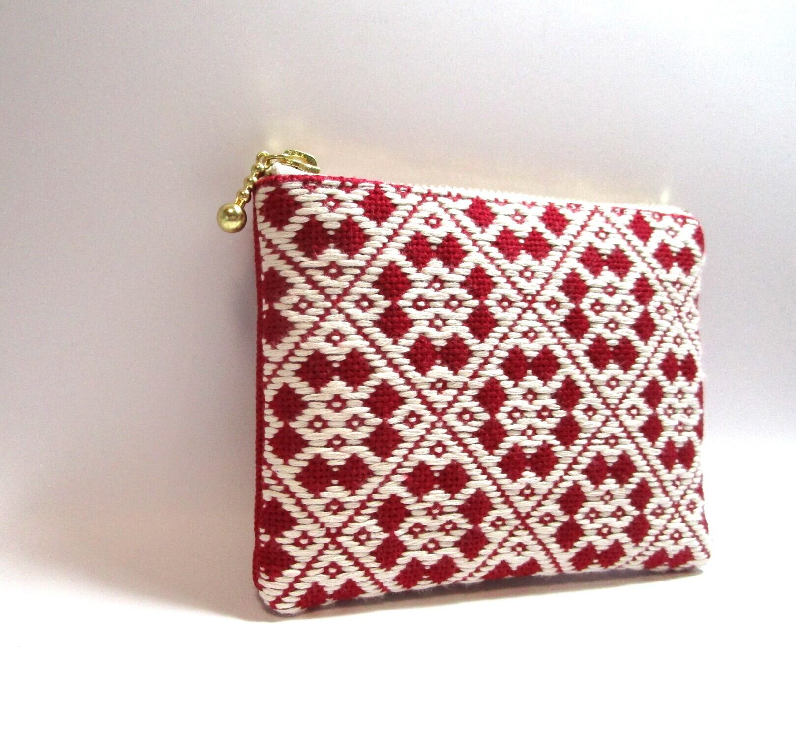 青森県津軽地方の伝統工芸『こぎん刺し』を施しました、ワインレッドにオフホワイトの美しいコントラストが魅力のファスナーポーチです。