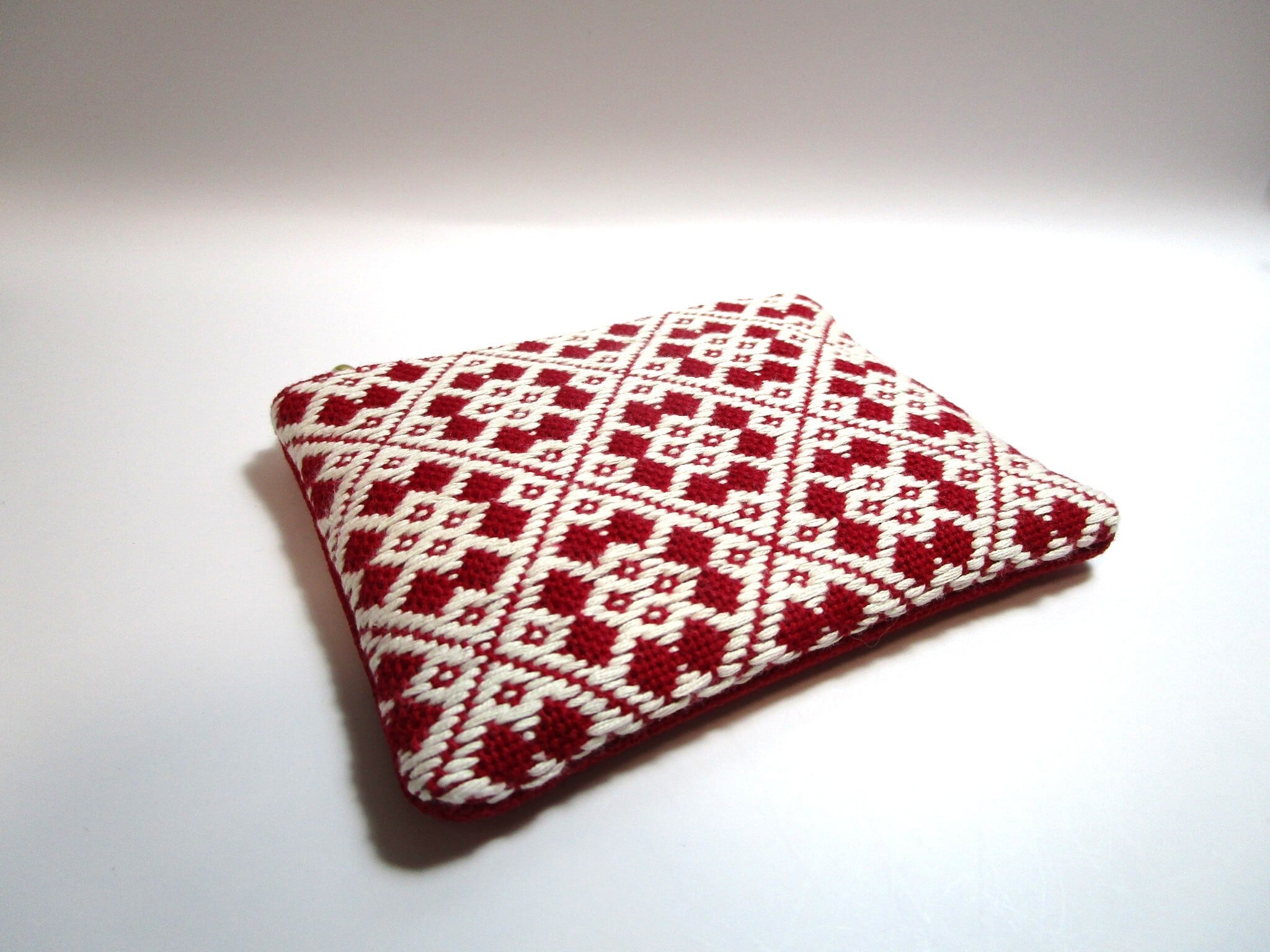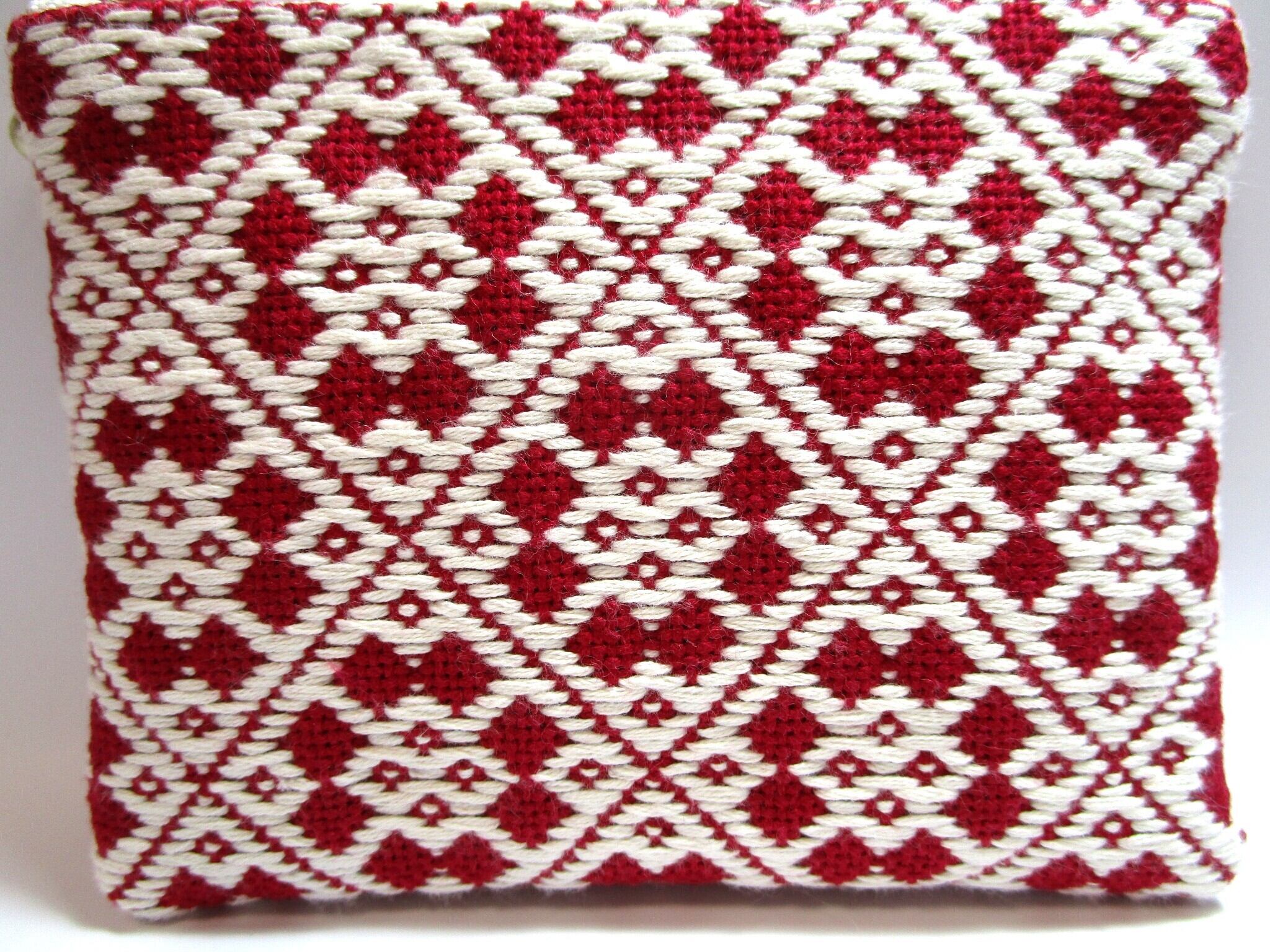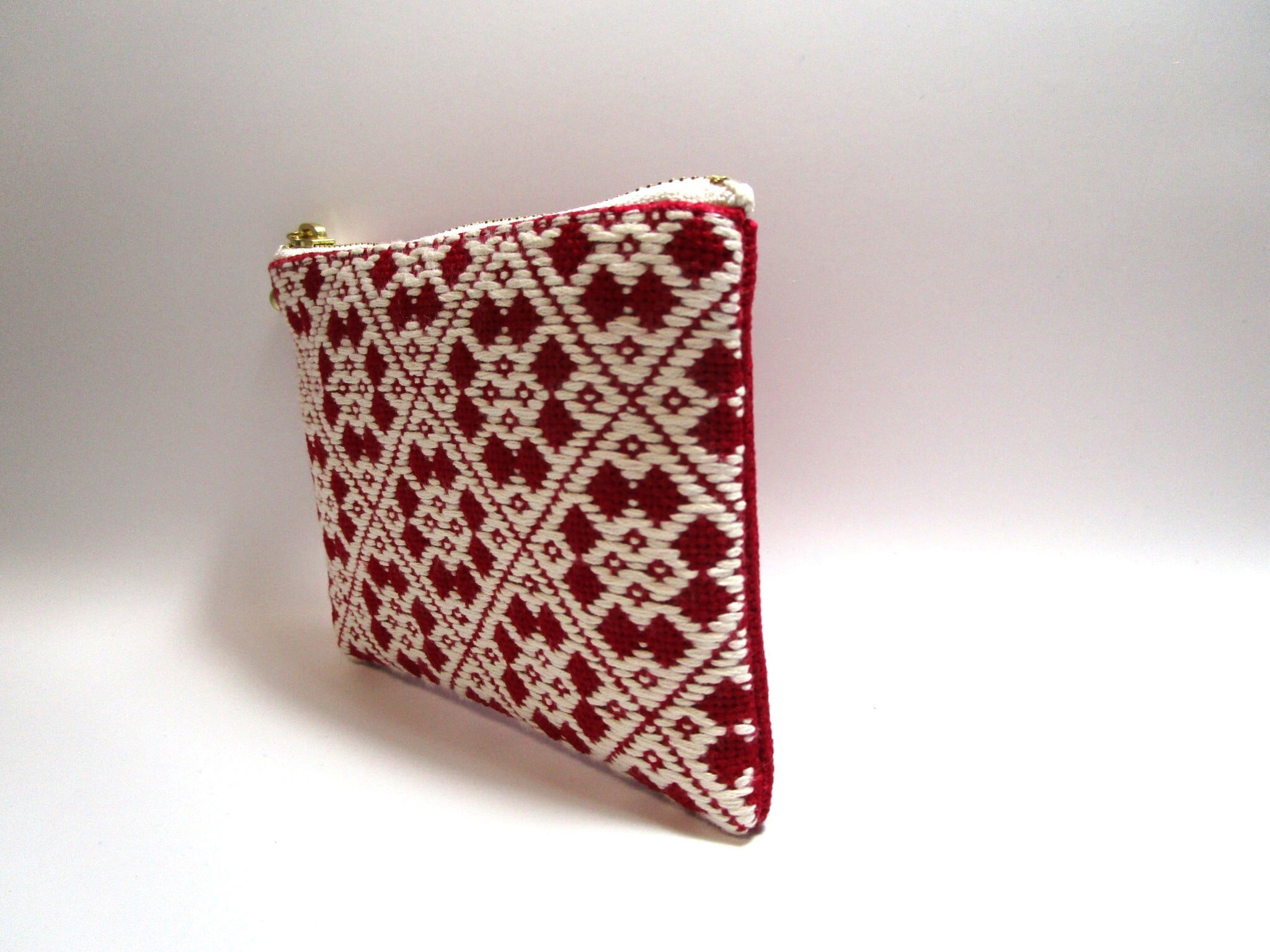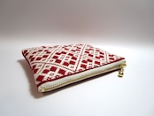 青森県津軽地方の伝統工芸『こぎん刺し』を施しました、ワインレッドにオフホワイトの美しいコントラストが魅力のファスナーポーチです。