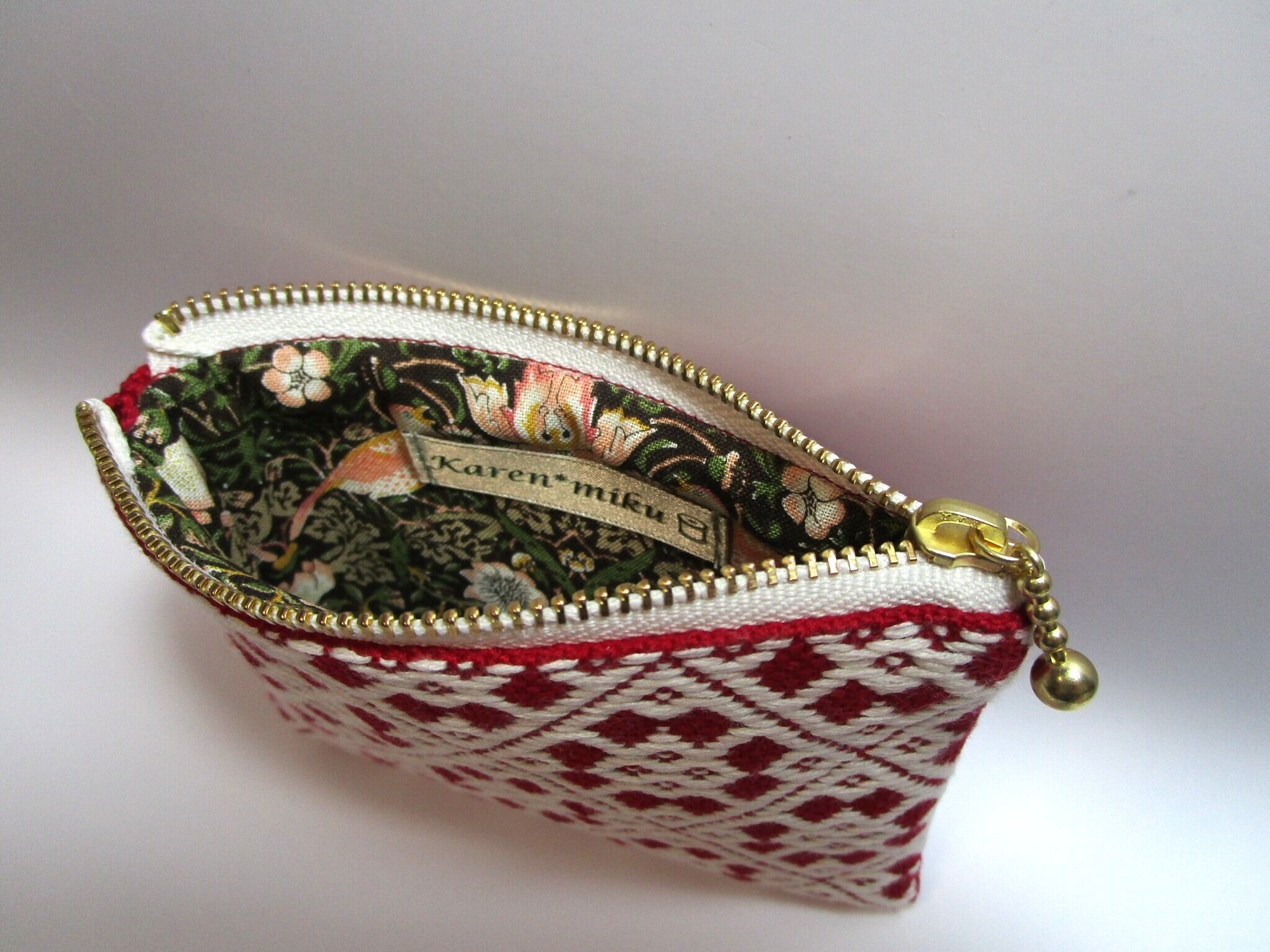 ファスナーには高級感のあるゴールドの玉つきを使用。そして内布には鳥と植物が調和した温かみのあるウィリアムモリス『いちご泥棒』のシーチング生地を合わせて、使うたびに心が和む仕上がりとなっています。