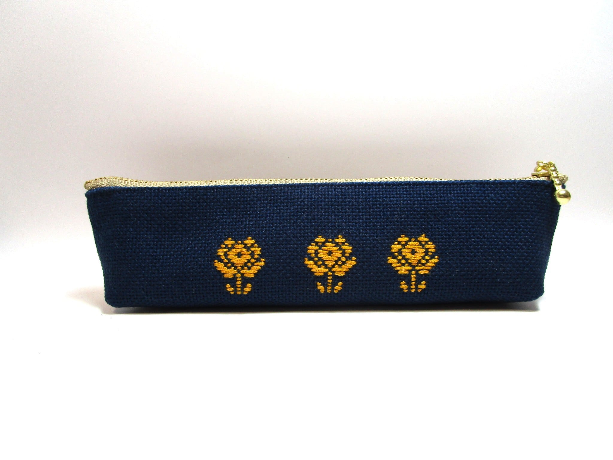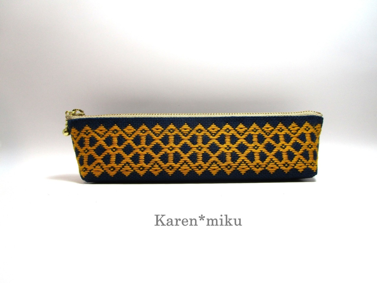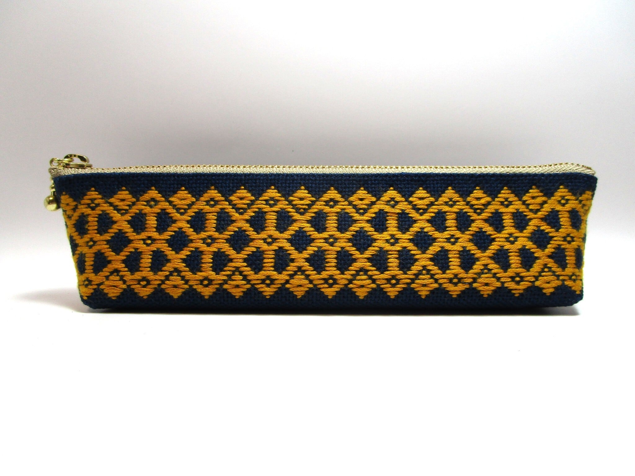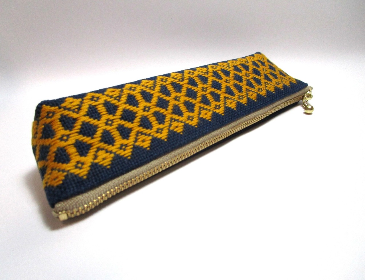『こぎん刺し』✳️猫の足あと✳️ペンケース・メガネケース ◆ネイビー×山吹色◆