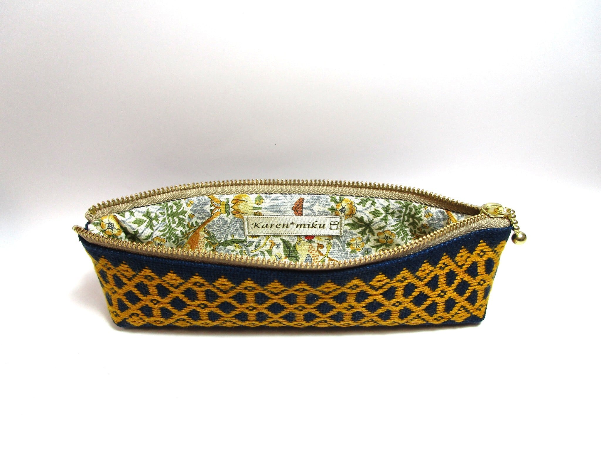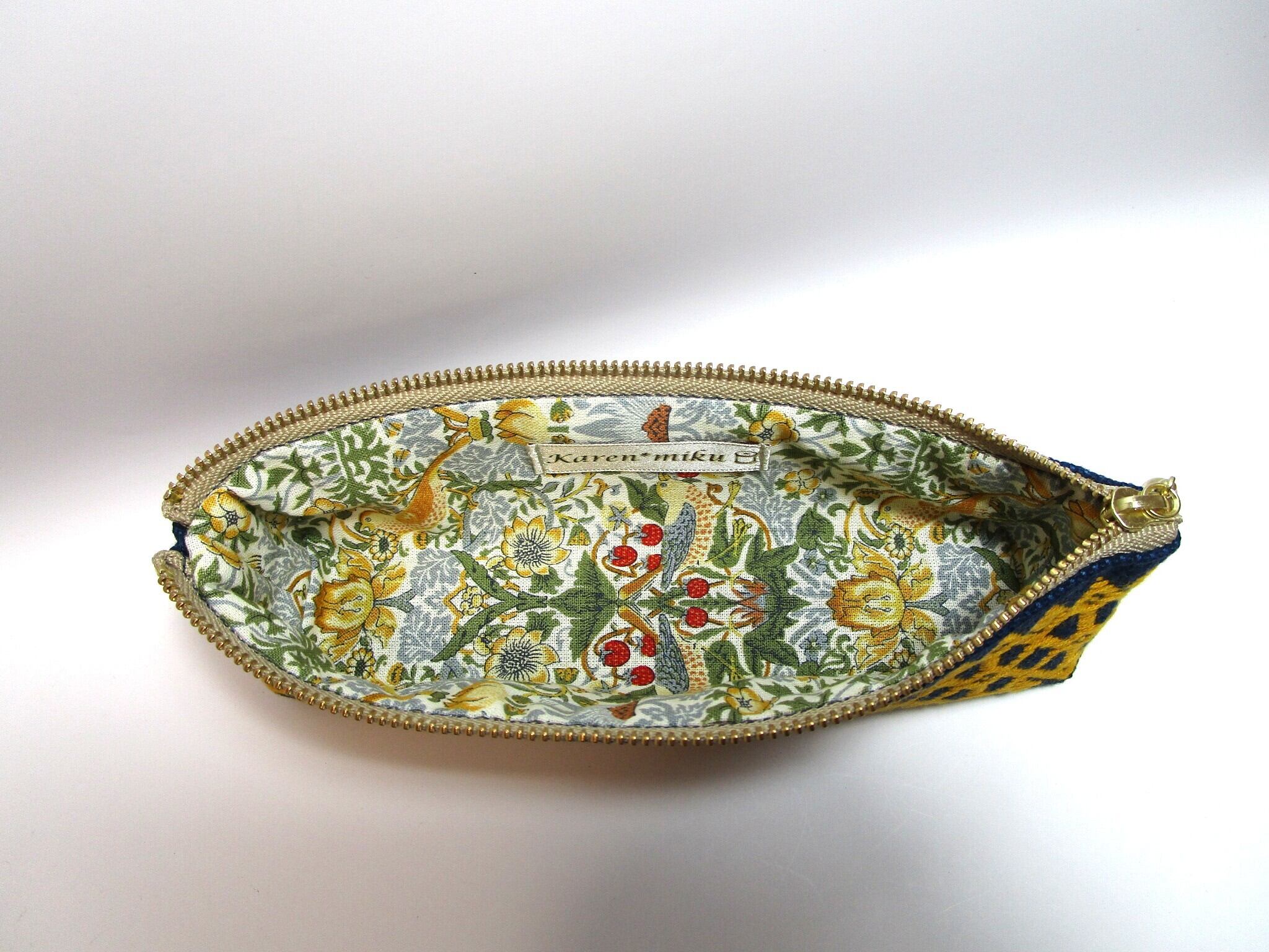 内布にはウィリアムモリス『いちご泥棒』のシーチング生地を使用しており、ペンやメガネをやさしく守りますので、安心してお使いいただけます。
